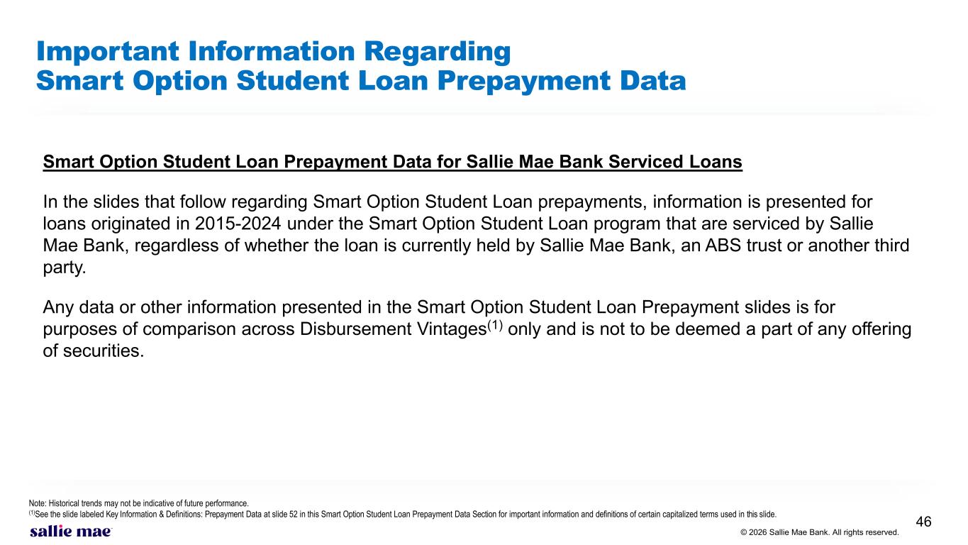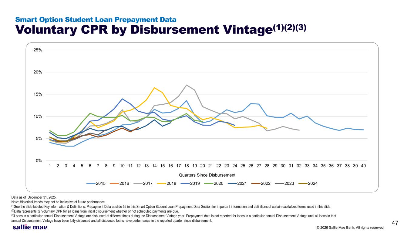 46 © 2026 Sallie Mae Bank. All rights reserved. Important Information Regarding Smart Option Student Loan Prepayment Data Smart Option Student Loan Prepayment Data for Sallie Mae Bank Serviced Loans In the slides that follow regarding Smart Option Student Loan prepayments, information is presented for loans originated in 2015-2024 under the Smart Option Student Loan program that are serviced by Sallie Mae Bank, regardless of whether the loan is currently held by Sallie Mae Bank, an ABS trust or another third party. Any data or other information presented in the Smart Option Student Loan Prepayment slides is for purposes of comparison across Disbursement Vintages(1) only and is not to be deemed a part of any offering of securities. Note: Historical trends may not be indicative of future performance. (1)See the slide labeled Key Information & Definitions: Prepayment Data at slide 52 in this Smart Option Student Loan Prepayment Data Section for important information and definitions of certain capitalized terms used in this slide.