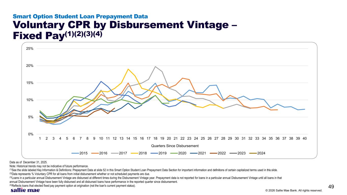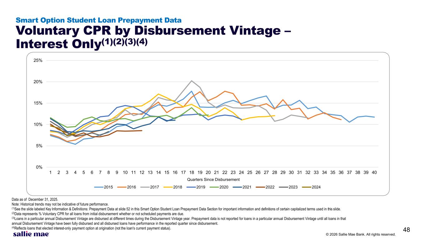 48 © 2026 Sallie Mae Bank. All rights reserved. Smart Option Student Loan Prepayment Data Voluntary CPR by Disbursement Vintage – Interest Only(1)(2)(3)(4) 0% 5% 10% 15% 20% 25% 1 2 3 4 5 6 7 8 9 10 11 12 13 14 15 16 17 18 19 20 21 22 23 24 25 26 27 28 29 30 31 32 33 34 35 36 37 38 39 40 Quarters Since Disbursement 2015 2016 2017 2018 2019 2020 2021 2022 2023 2024 Data as of December 31, 2025. Note: Historical trends may not be indicative of future performance. (1)See the slide labeled Key Information & Definitions: Prepayment Data at slide 52 in this Smart Option Student Loan Prepayment Data Section for important information and definitions of certain capitalized terms used in this slide. (2)Data represents % Voluntary CPR for all loans from initial disbursement whether or not scheduled payments are due. (3)Loans in a particular annual Disbursement Vintage are disbursed at different times during the Disbursement Vintage year. Prepayment data is not reported for loans in a particular annual Disbursement Vintage until all loans in that annual Disbursement Vintage have been fully disbursed and all disbursed loans have performance in the reported quarter since disbursement. (4)Reflects loans that elected interest-only payment option at origination (not the loan's current payment status).
