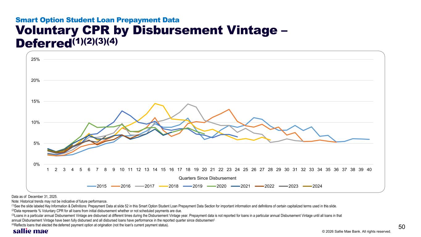 49 © 2026 Sallie Mae Bank. All rights reserved. Smart Option Student Loan Prepayment Data Voluntary CPR by Disbursement Vintage – Fixed Pay(1)(2)(3)(4) 0% 5% 10% 15% 20% 25% 1 2 3 4 5 6 7 8 9 10 11 12 13 14 15 16 17 18 19 20 21 22 23 24 25 26 27 28 29 30 31 32 33 34 35 36 37 38 39 40 Quarters Since Disbursement 2015 2016 2017 2018 2019 2020 2021 2022 2023 2024 Data as of December 31, 2025. Note: Historical trends may not be indicative of future performance. (1)See the slide labeled Key Information & Definitions: Prepayment Data at slide 52 in this Smart Option Student Loan Prepayment Data Section for important information and definitions of certain capitalized terms used in this slide. (2)Data represents % Voluntary CPR for all loans from initial disbursement whether or not scheduled payments are due. (3)Loans in a particular annual Disbursement Vintage are disbursed at different times during the Disbursement Vintage year. Prepayment data is not reported for loans in a particular annual Disbursement Vintage until all loans in that annual Disbursement Vintage have been fully disbursed and all disbursed loans have performance in the reported quarter since disbursement. (4)Reflects loans that elected fixed pay payment option at origination (not the loan's current payment status).