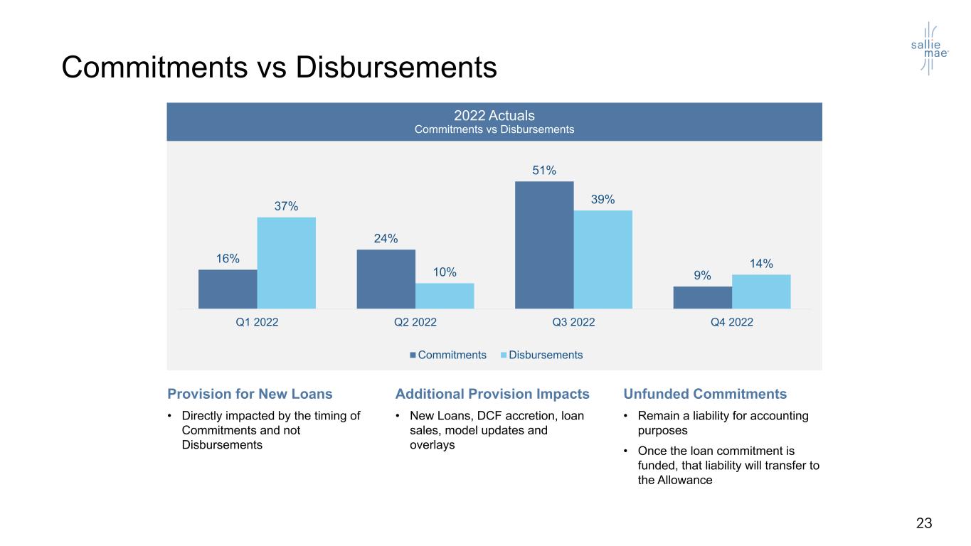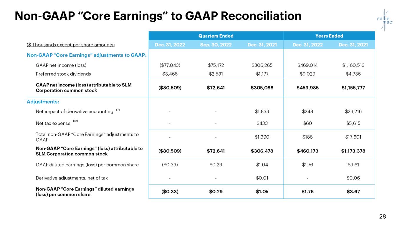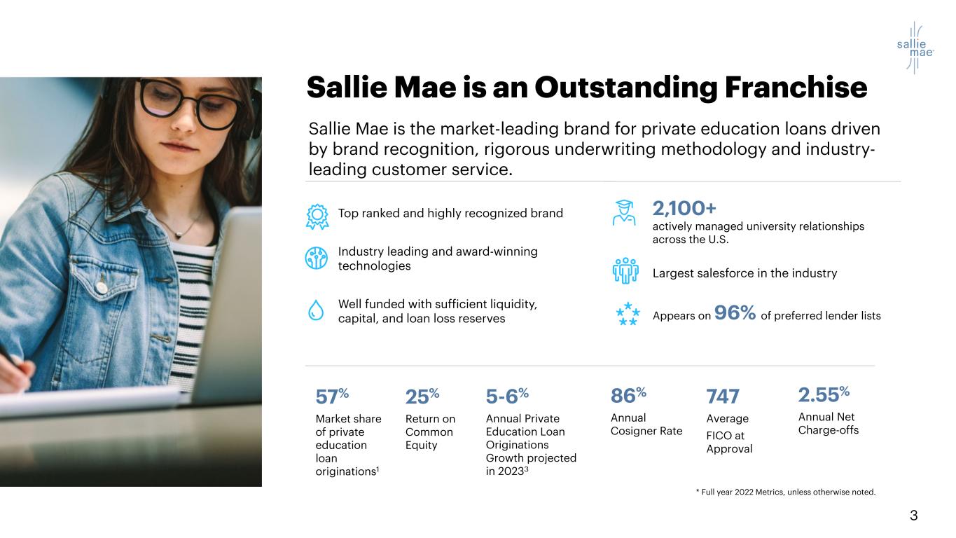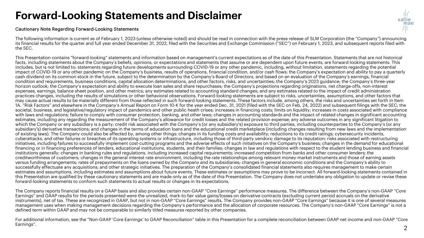 2 Forward-Looking Statements and Disclaimer Cautionary Note Regarding Forward-Looking Statements The following information is current as of February 1, 2023 (unless otherwise noted) and should be read in connection with the press release of SLM Corporation (the “Company”) announcing its financial results for the quarter and full year ended December 31, 2022, filed with the Securities and Exchange Commission (“SEC”) on February 1, 2023, and subsequent reports filed with the SEC. This Presentation contains “forward-looking” statements and information based on management’s current expectations as of the date of this Presentation. Statements that are not historical facts, including statements about the Company’s beliefs, opinions, or expectations and statements that assume or are dependent upon future events, are forward-looking statements. This includes, but is not limited to: statements regarding future developments surrounding COVID-19 or any other pandemic, including, without limitation, statements regarding the potential impact of COVID-19 or any other pandemic on the Company’s business, results of operations, financial condition, and/or cash flows; the Company’s expectation and ability to pay a quarterly cash dividend on its common stock in the future, subject to the determination by the Company’s Board of Directors, and based on an evaluation of the Company’s earnings, financial condition and requirements, business conditions, capital allocation determinations, and other factors, risks, and uncertainties; the Company’s 2023 guidance; the Company’s three-year horizon outlook; the Company’s expectation and ability to execute loan sales and share repurchases; the Company’s projections regarding originations, net charge-offs, non-interest expenses, earnings, balance sheet position, and other metrics; any estimates related to accounting standard changes; and any estimates related to the impact of credit administration practices changes, including the results of simulations or other behavioral observations. Forward-looking statements are subject to risks, uncertainties, assumptions, and other factors that may cause actual results to be materially different from those reflected in such forward-looking statements. These factors include, among others, the risks and uncertainties set forth in Item 1A. “Risk Factors” and elsewhere in the Company’s Annual Report on Form 10-K for the year ended Dec. 31, 2021 (filed with the SEC on Feb. 24, 2022) and subsequent filings with the SEC; the societal, business, and legislative/regulatory impact of pandemics and other public heath crises; increases in financing costs; limits on liquidity; increases in costs associated with compliance with laws and regulations; failure to comply with consumer protection, banking, and other laws; changes in accounting standards and the impact of related changes in significant accounting estimates, including any regarding the measurement of the Company’s allowance for credit losses and the related provision expense; any adverse outcomes in any significant litigation to which the Company or any subsidiary is a party; credit risk associated with the Company’s (or any subsidiary's) exposure to third parties, including counterparties to the Company’s (or any subsidiary's) derivative transactions; and changes in the terms of education loans and the educational credit marketplace (including changes resulting from new laws and the implementation of existing laws). The Company could also be affected by, among other things: changes in its funding costs and availability; reductions to its credit ratings; cybersecurity incidents, cyberattacks, and other failures or breaches of its operating systems or infrastructure, including those of third-party vendors; damage to its reputation; risks associated with restructuring initiatives, including failures to successfully implement cost-cutting programs and the adverse effects of such initiatives on the Company’s business; changes in the demand for educational financing or in financing preferences of lenders, educational institutions, students, and their families; changes in law and regulations with respect to the student lending business and financial institutions generally; changes in banking rules and regulations, including increased capital requirements; increased competition from banks and other consumer lenders; the creditworthiness of customers; changes in the general interest rate environment, including the rate relationships among relevant money-market instruments and those of earning assets versus funding arrangements; rates of prepayments on the loans owned by the Company and its subsidiaries; changes in general economic conditions and the Company’s ability to successfully effectuate any acquisitions; and other strategic initiatives. The preparation of the Company’s consolidated financial statements also requires management to make certain estimates and assumptions, including estimates and assumptions about future events. These estimates or assumptions may prove to be incorrect. All forward-looking statements contained in this Presentation are qualified by these cautionary statements and are made only as of the date of this Presentation. The Company does not undertake any obligation to update or revise these forward-looking statements to conform such statements to actual results or changes in its expectations. The Company reports financial results on a GAAP basis and also provides certain non-GAAP “Core Earnings” performance measures. The difference between the Company’s non-GAAP “Core Earnings” and GAAP results for the periods presented were the unrealized, mark-to-fair value gains/losses on derivative contracts (excluding current period accruals on the derivative instruments), net of tax. These are recognized in GAAP, but not in non-GAAP “Core Earnings” results. The Company provides non-GAAP “Core Earnings” becau