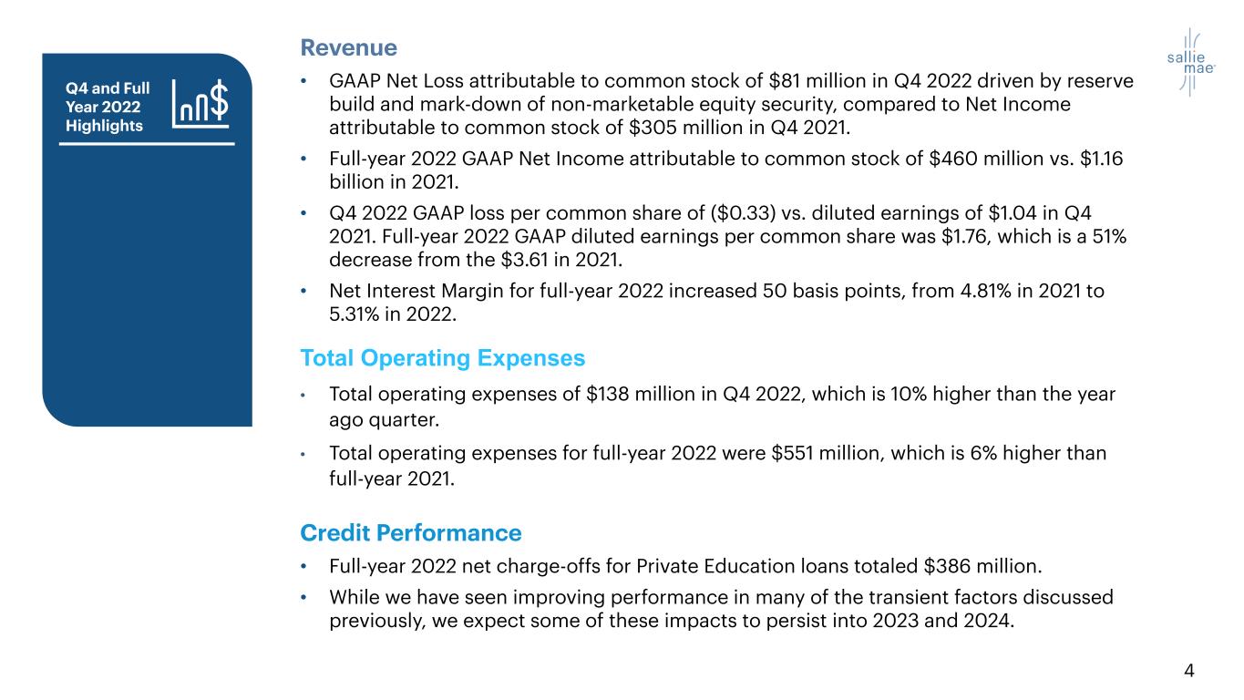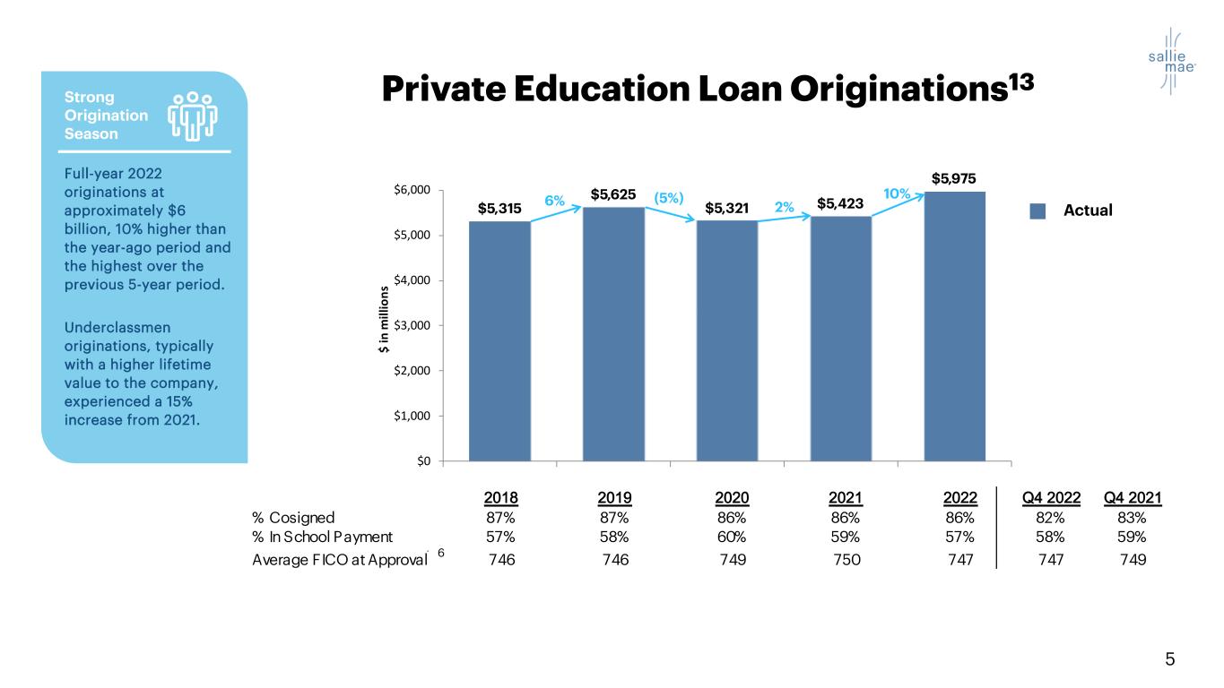 4 Revenue • GAAP Net Loss attributable to common stock of $81 million in Q4 2022 driven by reserve build and mark-down of non-marketable equity security, compared to Net Income attributable to common stock of $305 million in Q4 2021. • Full-year 2022 GAAP Net Income attributable to common stock of $460 million vs. $1.16 billion in 2021. • Q4 2022 GAAP loss per common share of ($0.33) vs. diluted earnings of $1.04 in Q4 2021. Full-year 2022 GAAP diluted earnings per common share was $1.76, which is a 51% decrease from the $3.61 in 2021. • Net Interest Margin for full-year 2022 increased 50 basis points, from 4.81% in 2021 to 5.31% in 2022. Total Operating Expenses • Total operating expenses of $138 million in Q4 2022, which is 10% higher than the year ago quarter. • Total operating expenses for full-year 2022 were $551 million, which is 6% higher than full-year 2021. Credit Performance • Full-year 2022 net charge-offs for Private Education loans totaled $386 million. • While we have seen improving performance in many of the transient factors discussed previously, we expect some of these impacts to persist into 2023 and 2024. Q4 and Full Year 2022 Highlights