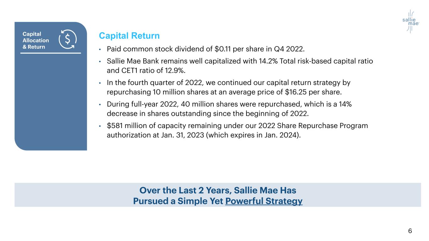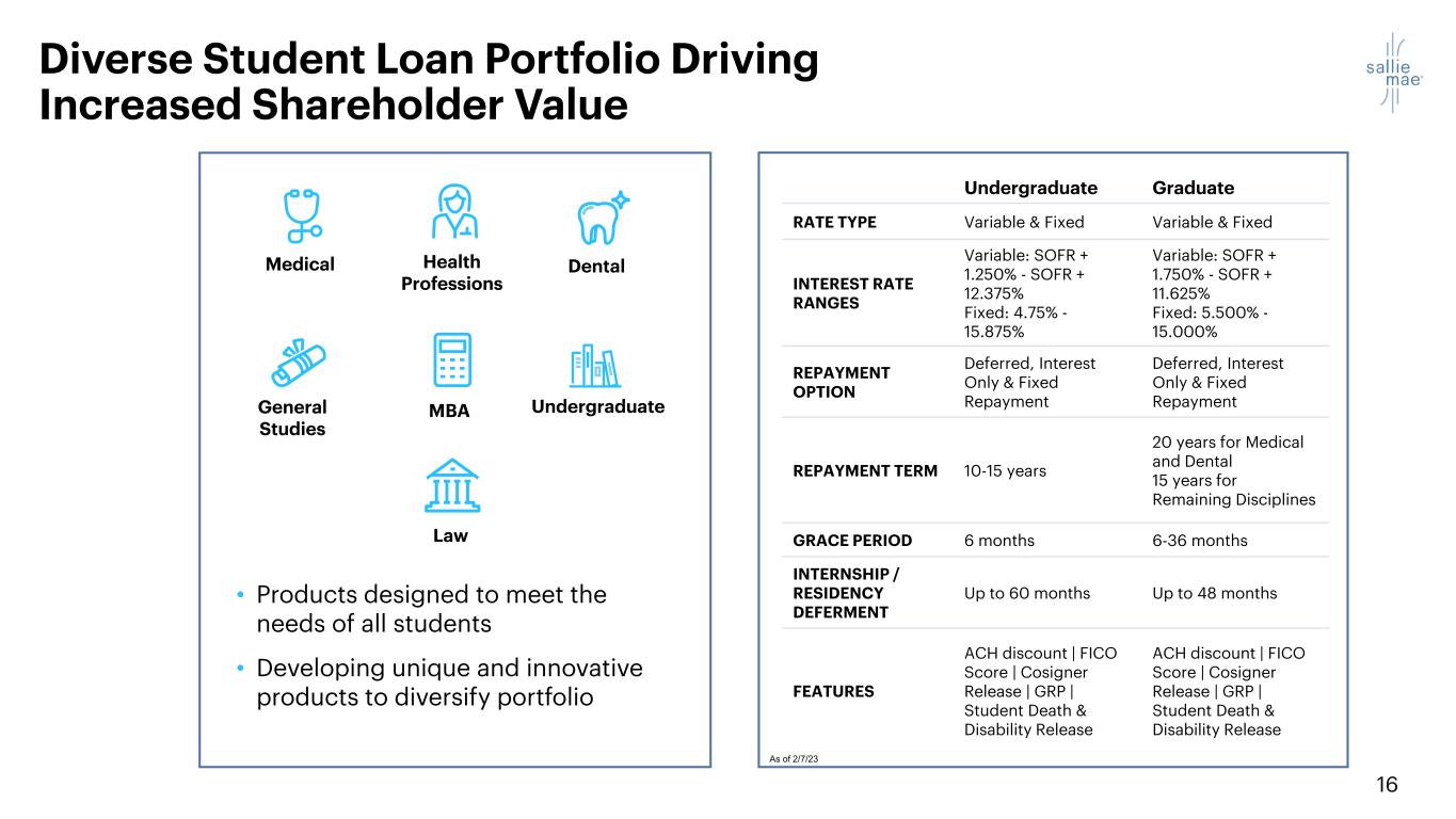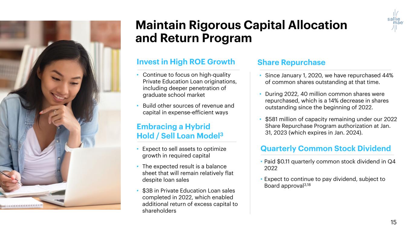 15 Maintain Rigorous Capital Allocation and Return Program Invest in High ROE Growth • Continue to focus on high-quality Private Education Loan originations, including deeper penetration of graduate school market • Build other sources of revenue and capital in expense-efficient ways Quarterly Common Stock Dividend • Paid $0.11 quarterly common stock dividend in Q4 2022 • Expect to continue to pay dividend, subject to Board approval3,18 Share Repurchase • Since January 1, 2020, we have repurchased 44% of common shares outstanding at that time. • During 2022, 40 million common shares were repurchased, which is a 14% decrease in shares outstanding since the beginning of 2022. • $581 million of capacity remaining under our 2022 Share Repurchase Program authorization at Jan. 31, 2023 (which expires in Jan. 2024). We allocate capital with discipline Embracing a Hybrid Hold / Sell Loan Model3 • Expect to sell assets to optimize growth in required capital • The expected result is a balance sheet that will remain relatively flat despite loan sales • $3B in Private Education Loan sales completed in 2022, which enabled additional return of excess capital to shareholders