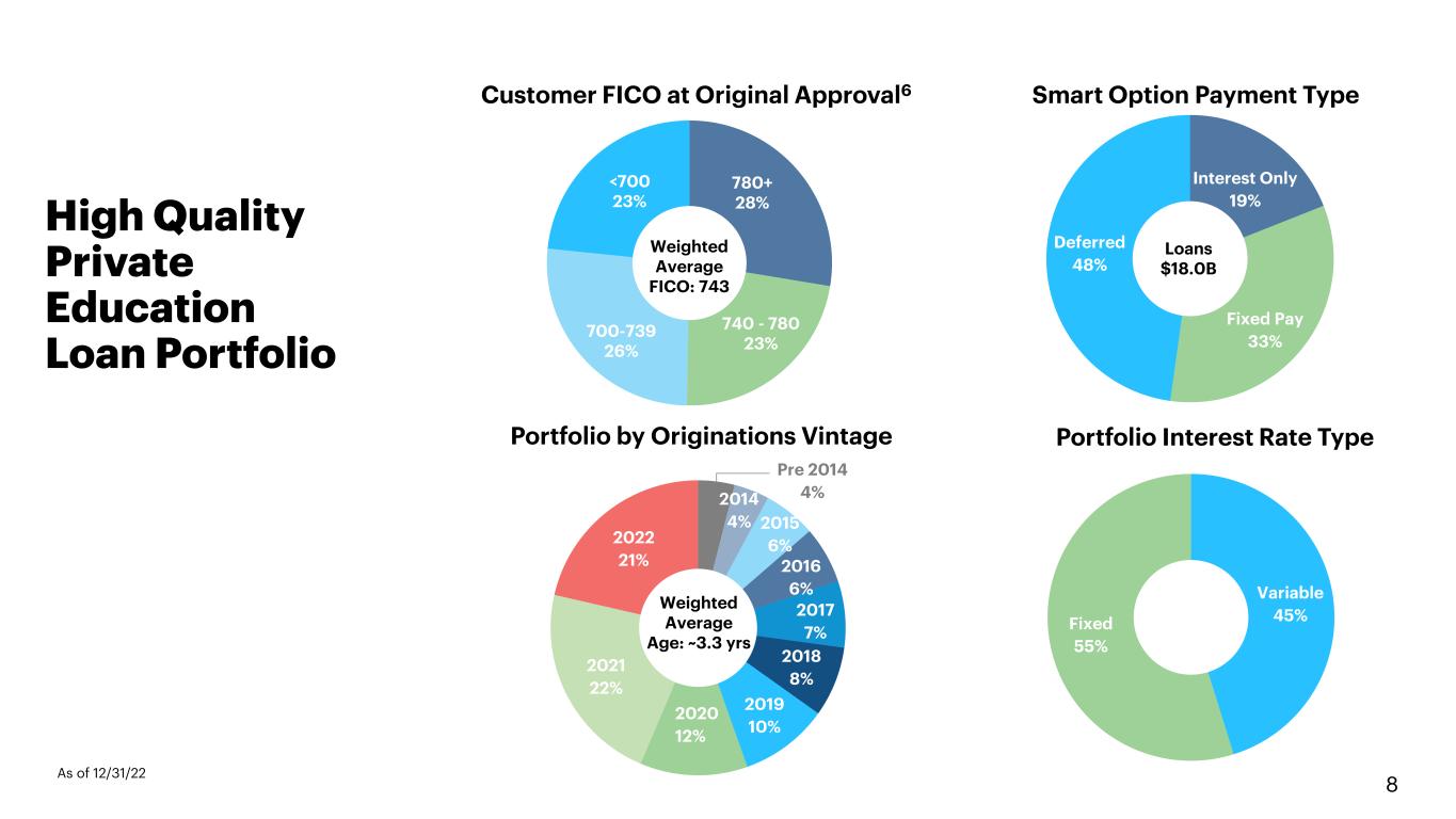 5 Private Education Loan Originations13 Actual 2018 87% 57% 746 2019 87% 58% 746 2020 86% 60% 749 2021 86% 59% 750 2022 86% 57% 747 Q4 2022 82% 58% 747 Q4 2021 83% 59% 749 $5,315 $5,625 $5,321 $5,423 $5,975 $0 $1,000 $2,000 $3,000 $4,000 $5,000 $6,000 $ in m ill io ns 6% (5%) 2% 10% Strong Origination Season Full-year 2022 originations at approximately $6 billion, 10% higher than the year-ago period and the highest over the previous 5-year period. Underclassmen originations, typically with a higher lifetime value to the company, experienced a 15% increase from 2021. % Cosigned % In School Payment Average FICO at Approval1 06