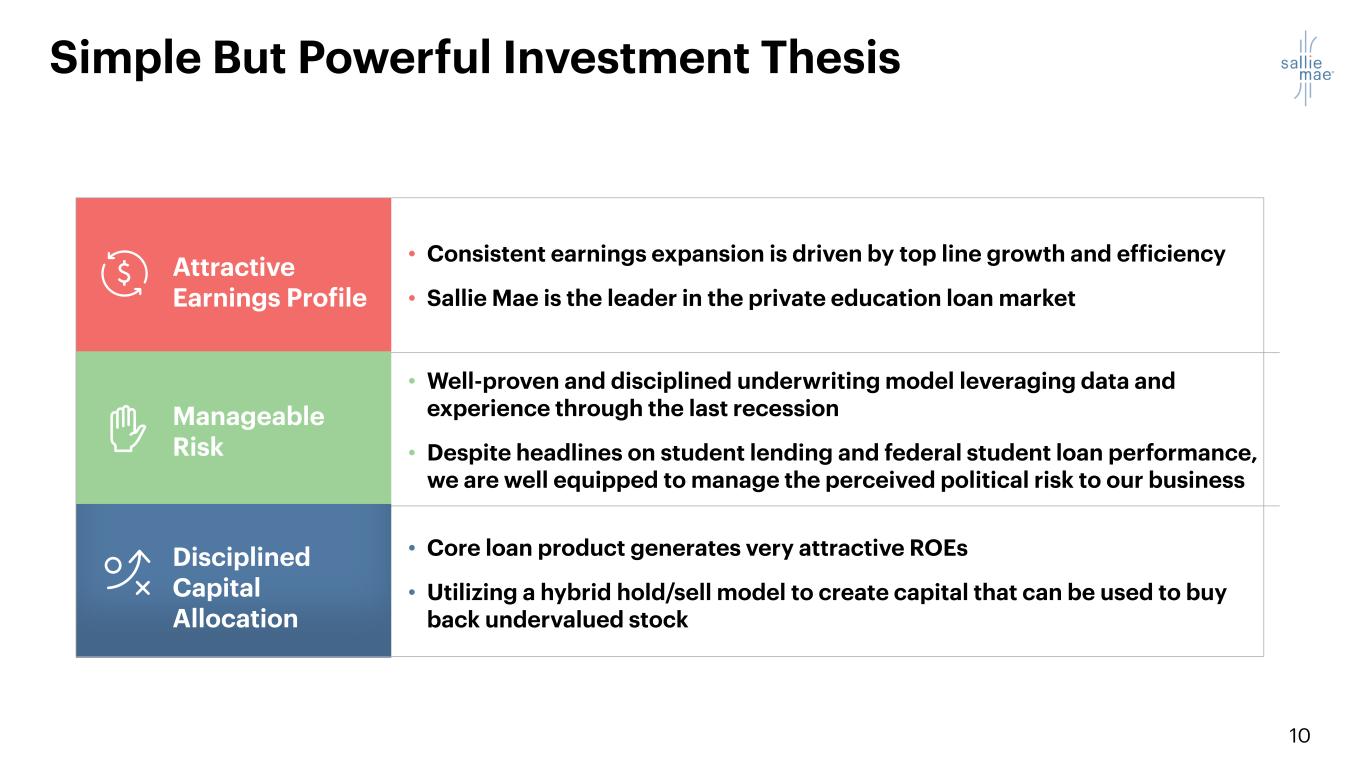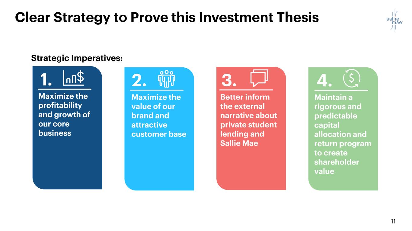 10 Simple But Powerful Investment Thesis • Consistent earnings expansion is driven by top line growth and efficiency • Sallie Mae is the leader in the private education loan market • Well-proven and disciplined underwriting model leveraging data and experience through the last recession • Despite headlines on student lending and federal student loan performance, we are well equipped to manage the perceived political risk to our business • Core loan product generates very attractive ROEs • Utilizing a hybrid hold/sell model to create capital that can be used to buy back undervalued stock Attractive Earnings Profile Manageable Risk Disciplined Capital Allocation