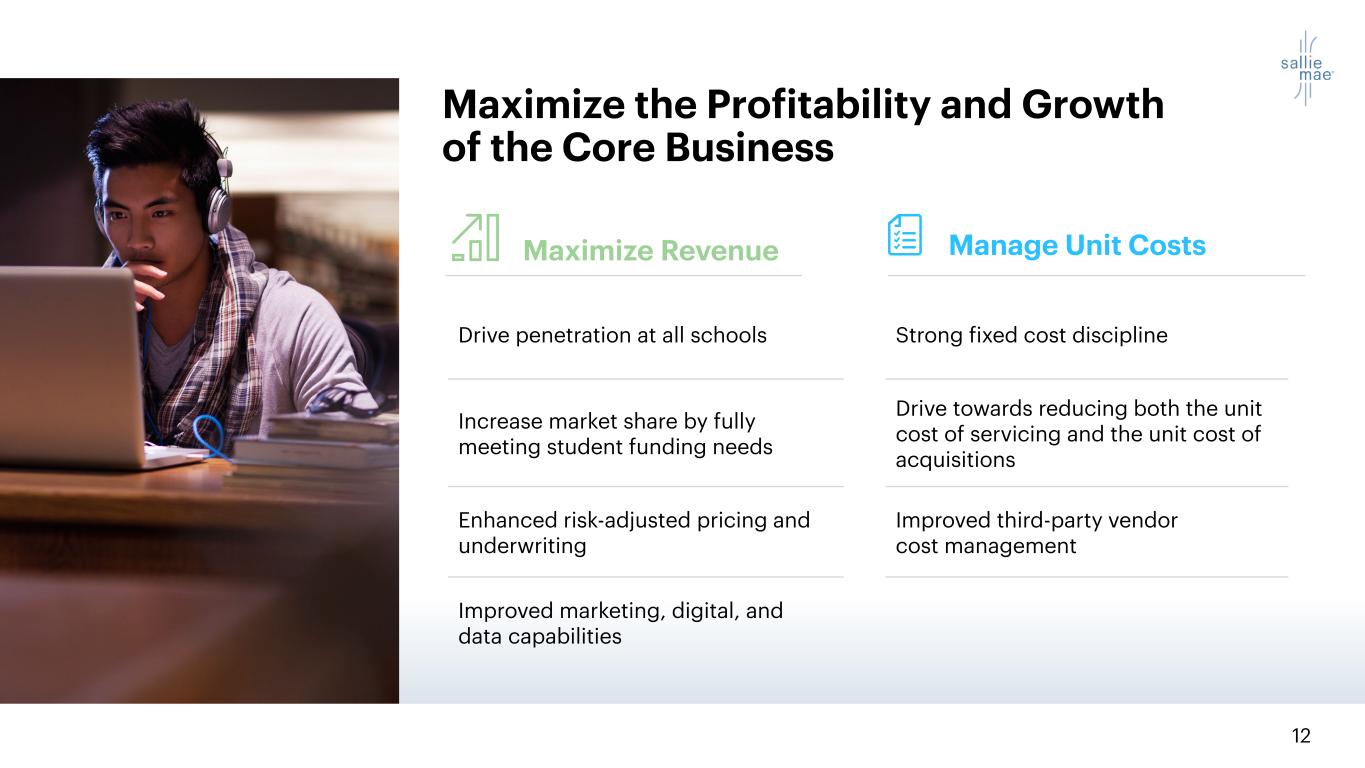 11 Clear Strategy to Prove this Investment Thesis Maximize the profitability and growth of our core business Better inform the external narrative about private student lending and Sallie Mae Maximize the value of our brand and attractive customer base Maintain a rigorous and predictable capital allocation and return program to create shareholder value 1. 2. 3. 4. Strategic Imperatives: