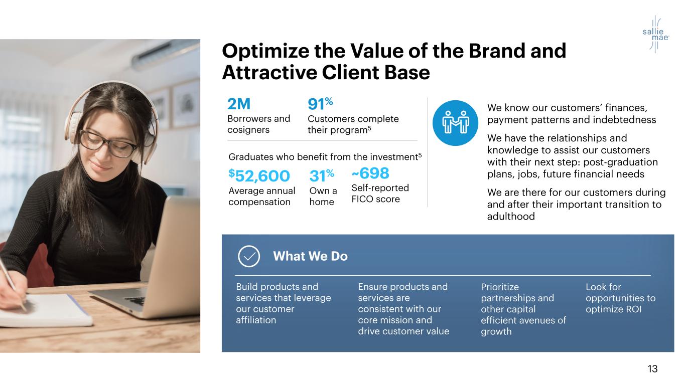 12 Maximize the Profitability and Growth of the Core Business Maximize Revenue Manage Unit Costs Drive penetration at all schools Increase market share by fully meeting student funding needs Enhanced risk-adjusted pricing and underwriting Improved marketing, digital, and data capabilities Strong fixed cost discipline Drive towards reducing both the unit cost of servicing and the unit cost of acquisitions Improved third-party vendor cost management