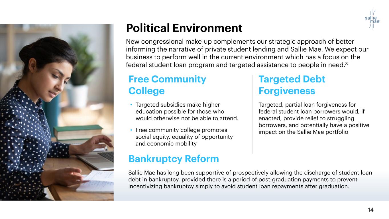 14 Free Community College • Targeted subsidies make higher education possible for those who would otherwise not be able to attend. • Free community college promotes social equity, equality of opportunity and economic mobility Political Environment New congressional make-up complements our strategic approach of better informing the narrative of private student lending and Sallie Mae. We expect our business to perform well in the current environment which has a focus on the federal student loan program and targeted assistance to people in need.3 Bankruptcy Reform Sallie Mae has long been supportive of prospectively allowing the discharge of student loan debt in bankruptcy, provided there is a period of post-graduation payments to prevent incentivizing bankruptcy simply to avoid student loan repayments after graduation. Targeted Debt Forgiveness Targeted, partial loan forgiveness for federal student loan borrowers would, if enacted, provide relief to struggling borrowers, and potentially have a positive impact on the Sallie Mae portfolio