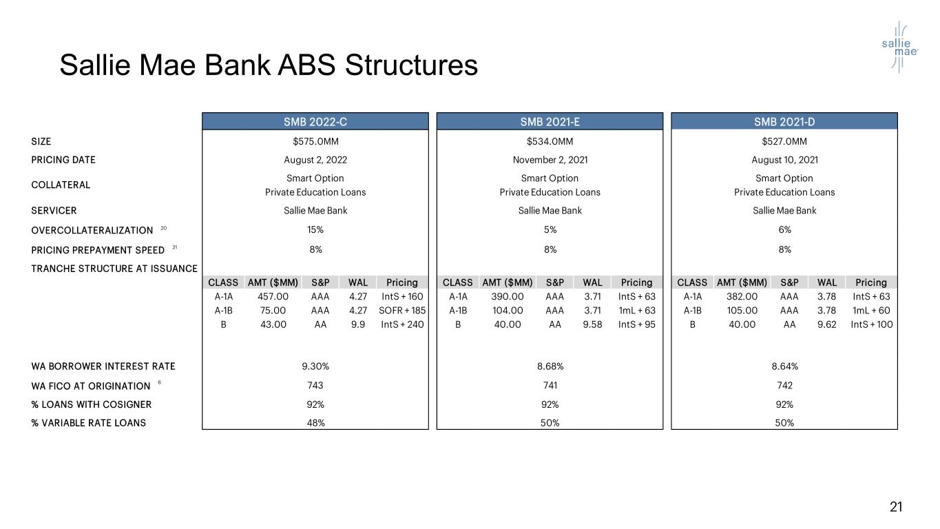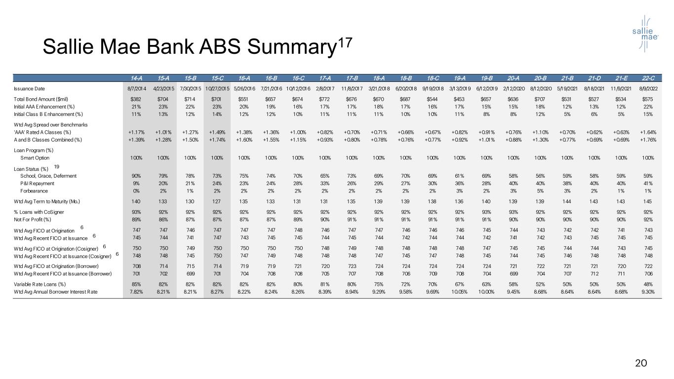 20 Sallie Mae Bank ABS Summary17 14-A 15-A 15-B 15-C 16-A 16-B 16-C 17-A 17-B 18-A 18-B 18-C 19-A 19-B 20-A 20-B 21-B 21-D 21-E 22-C Issuance Date 8/7/201 4 4/23/201 5 7/30/201 5 1 0/27/201 5 5/26/201 6 7/21 /201 6 1 0/1 2/201 6 2/8/201 7 1 1 /8/201 7 3/21 /201 8 6/20/201 8 9/1 9/201 8 3/1 3/201 9 6/1 2/201 9 2/1 2/2020 8/1 2/2020 5/1 9/2021 8/1 8/2021 1 1 /9/2021 8/9/2022 Total Bond Amount ($mil) $382 $704 $71 4 $701 $551 $657 $674 $772 $676 $670 $687 $544 $453 $657 $636 $707 $531 $527 $534 $575 Initial AAA Enhancement (%) 21 % 23% 22% 23% 20% 1 9% 1 6% 1 7% 1 7% 1 8% 1 7% 1 6% 1 7% 1 5% 1 5% 1 8% 1 2% 1 3% 1 2% 22% Initial Class B Enhancement (%) 1 1 % 1 3% 1 2% 1 4% 1 2% 1 2% 1 0% 1 1 % 1 1 % 1 1 % 1 0% 1 0% 1 1 % 8% 8% 1 2% 5% 6% 5% 1 5% Wtd Avg Spread over Benchmarks 'AAA' Rated A Classes (%) +1 .1 7% +1 .01 % +1 .27% +1 .49% +1 .38% +1 .36% +1 .00% +0.82% +0.70% +0.71 % +0.66% +0.67% +0.82% +0.91 % +0.76% +1 .1 0% +0.70% +0.62% +0.63% +1 .64% A and B Classes Combined (%) +1 .39% +1 .28% +1 .50% +1 .74% +1 .60% +1 .55% +1 .1 5% +0.93% +0.80% +0.78% +0.76% +0.77% +0.92% +1 .01 % +0.88% +1 .30% +0.77% +0.69% +0.69% +1 .76% Loan Program (%) Smart Option 1 00% 1 00% 1 00% 1 00% 1 00% 1 00% 1 00% 1 00% 1 00% 1 00% 1 00% 1 00% 1 00% 1 00% 1 00% 1 00% 1 00% 1 00% 1 00% 1 00% Loan Status (%) (9) School, Grace, Deferment 90% 79% 78% 73% 75% 74% 70% 65% 73% 69% 70% 69% 61 % 69% 58% 56% 59% 58% 59% 59% P&I Repayment 9% 20% 21 % 24% 23% 24% 28% 33% 26% 29% 27% 30% 36% 28% 40% 40% 38% 40% 40% 41 % Forbearance 0% 2% 1 % 2% 2% 2% 2% 2% 2% 2% 2% 2% 3% 2% 3% 5% 3% 2% 1 % 1 % Wtd Avg Term to Maturity (Mo.) 1 40 1 33 1 30 1 27 1 35 1 33 1 31 1 31 1 35 1 39 1 39 1 38 1 36 1 40 1 39 1 39 1 44 1 43 1 43 1 45 % Loans with CoSigner 93% 92% 92% 92% 92% 92% 92% 92% 92% 92% 92% 92% 92% 93% 93% 92% 92% 92% 92% 92% Not For Profit (%) 89% 86% 87% 87% 87% 87% 89% 90% 91 % 91 % 91 % 91 % 91 % 91 % 90% 90% 90% 90% 90% 92% Wtd Avg FICO at Origination (1 0) 747 747 746 747 747 747 748 746 747 747 746 746 746 745 744 743 742 742 741 743 Wtd Avg Recent FICO at Issuance (1 0) 745 744 741 747 743 745 745 744 745 744 742 744 744 742 741 742 743 745 745 745 Wtd Avg FICO at Origination (Cosigner) (1 0) 750 750 749 750 750 750 750 748 749 748 748 748 748 747 745 745 744 744 743 745 Wtd Avg Recent FICO at Issuance (Cosigner) (1 0) 748 748 745 750 747 749 748 748 748 747 745 747 748 745 744 745 746 748 748 748 Wtd Avg FICO at Origination (Borrower) 708 71 4 71 5 71 4 71 9 71 9 721 720 723 724 724 724 724 724 721 722 721 721 720 722 Wtd Avg Recent FICO at Issuance (Borrower) 701 702 699 701 704 708 708 705 707 708 706 709 708 704 699 704 707 71 2 71 1 706 Variable Rate Loans (%) 85% 82% 82% 82% 82% 82% 80% 81 % 80% 75% 72% 70% 67% 63% 58% 52% 50% 50% 50% 48% Wtd Avg Annual Borrower Interest Rate 7.82% 8.21 % 8.21 % 8.27% 8.22% 8.24% 8.26% 8.39% 8.94% 9.29% 9.58% 9.69% 1 0.05% 1 0.00% 9.45% 8.68% 8.64% 8.64% 8.68% 9.30% 19 6 6 6 6
