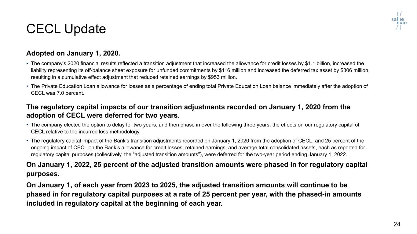 24 CECL Update Adopted on January 1, 2020. • The company’s 2020 financial results reflected a transition adjustment that increased the allowance for credit losses by $1.1 billion, increased the liability representing its off-balance sheet exposure for unfunded commitments by $116 million and increased the deferred tax asset by $306 million, resulting in a cumulative effect adjustment that reduced retained earnings by $953 million. • The Private Education Loan allowance for losses as a percentage of ending total Private Education Loan balance immediately after the adoption of CECL was 7.0 percent. The regulatory capital impacts of our transition adjustments recorded on January 1, 2020 from the adoption of CECL were deferred for two years. • The company elected the option to delay for two years, and then phase in over the following three years, the effects on our regulatory capital of CECL relative to the incurred loss methodology. • The regulatory capital impact of the Bank’s transition adjustments recorded on January 1, 2020 from the adoption of CECL, and 25 percent of the ongoing impact of CECL on the Bank’s allowance for credit losses, retained earnings, and average total consolidated assets, each as reported for regulatory capital purposes (collectively, the “adjusted transition amounts”), were deferred for the two-year period ending January 1, 2022. On January 1, 2022, 25 percent of the adjusted transition amounts were phased in for regulatory capital purposes. On January 1, of each year from 2023 to 2025, the adjusted transition amounts will continue to be phased in for regulatory capital purposes at a rate of 25 percent per year, with the phased-in amounts included in regulatory capital at the beginning of each year.