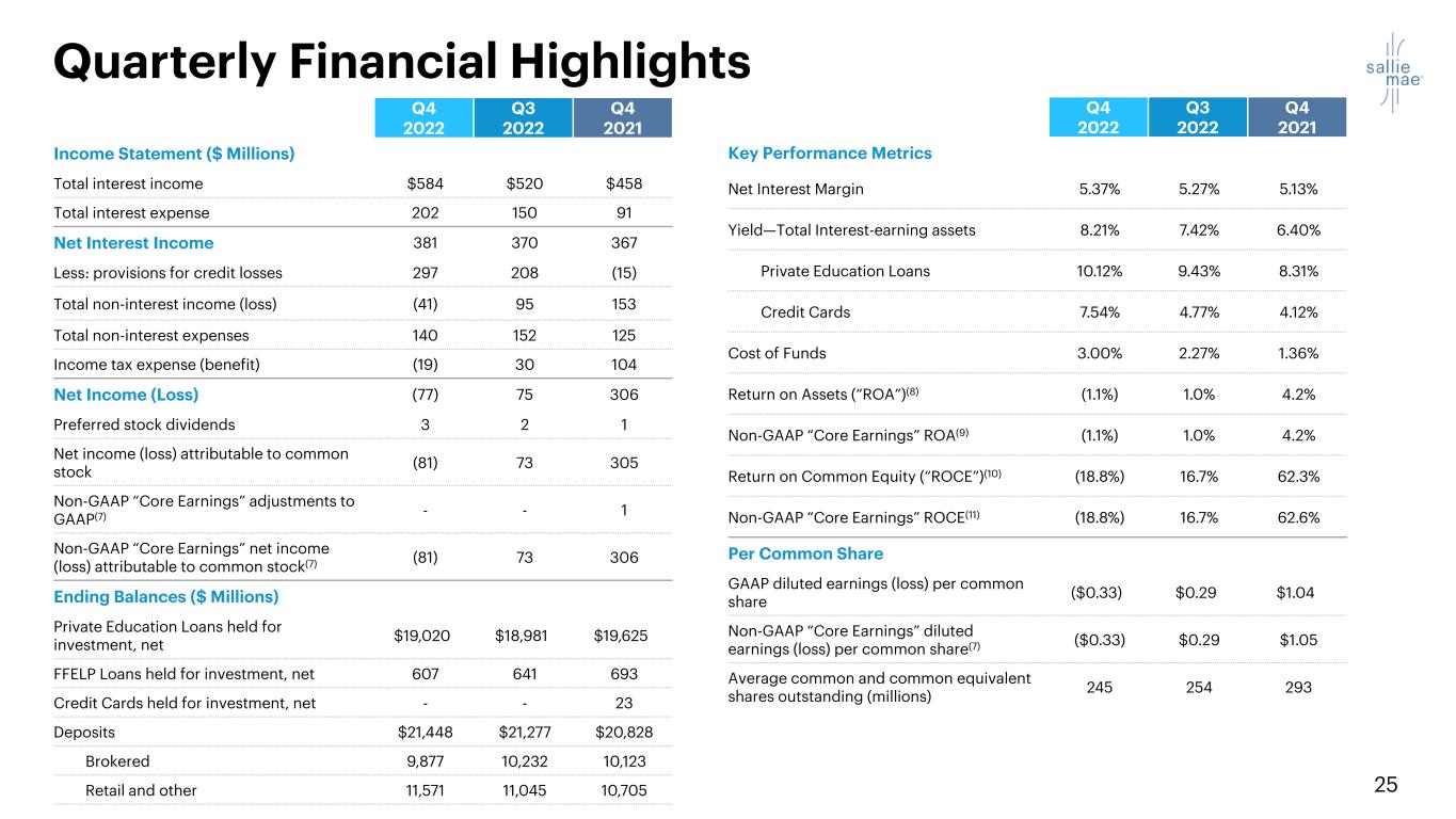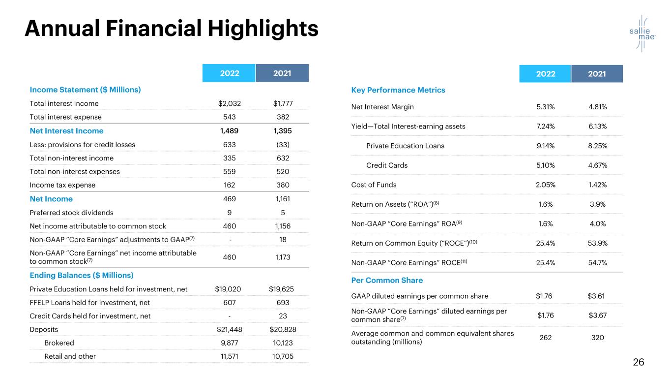 26 2022 2021 Key Performance Metrics Net Interest Margin 5.31% 4.81% Yield—Total Interest-earning assets 7.24% 6.13% Private Education Loans 9.14% 8.25% Credit Cards 5.10% 4.67% Cost of Funds 2.05% 1.42% Return on Assets (“ROA”)(8) 1.6% 3.9% Non-GAAP “Core Earnings” ROA(9) 1.6% 4.0% Return on Common Equity (“ROCE”)(10) 25.4% 53.9% Non-GAAP “Core Earnings” ROCE(11) 25.4% 54.7% Per Common Share GAAP diluted earnings per common share $1.76 $3.61 Non-GAAP “Core Earnings” diluted earnings per common share(7) $1.76 $3.67 Average common and common equivalent shares outstanding (millions) 262 320 Annual Financial Highlights 2022 2021 Income Statement ($ Millions) Total interest income $2,032 $1,777 Total interest expense 543 382 Net Interest Income 1,489 1,395 Less: provisions for credit losses 633 (33) Total non-interest income 335 632 Total non-interest expenses 559 520 Income tax expense 162 380 Net Income 469 1,161 Preferred stock dividends 9 5 Net income attributable to common stock 460 1,156 Non-GAAP “Core Earnings” adjustments to GAAP(7) - 18 Non-GAAP “Core Earnings” net income attributable to common stock(7) 460 1,173 Ending Balances ($ Millions) Private Education Loans held for investment, net $19,020 $19,625 FFELP Loans held for investment, net 607 693 Credit Cards held for investment, net - 23 Deposits $21,448 $20,828 Brokered 9,877 10,123 Retail and other 11,571 10,705