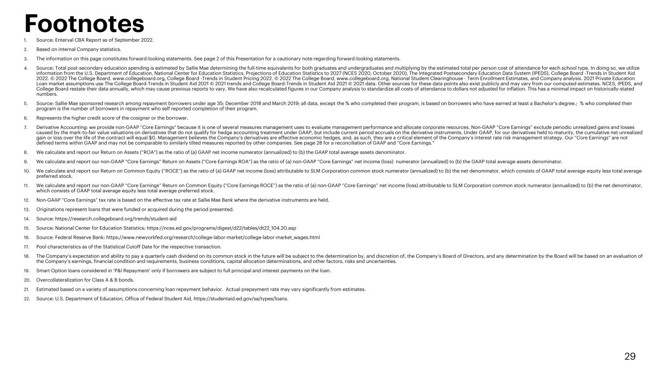 29 Footnotes 1. Source: Enterval CBA Report as of September 2022. 2. Based on internal Company statistics. 3. The information on this page constitutes forward-looking statements. See page 2 of this Presentation for a cautionary note regarding forward-looking statements. 4. Source: Total post-secondary education spending is estimated by Sallie Mae determining the full-time equivalents for both graduates and undergraduates and multiplying by the estimated total per person cost of attendance for each school type. In doing so, we utilize information from the U.S. Department of Education, National Center for Education Statistics, Projections of Education Statistics to 2027 (NCES 2020, October 2020), The Integrated Postsecondary Education Data System (IPEDS), College Board -Trends in Student Aid 2022. © 2022 The College Board, www.collegeboard.org, College Board -Trends in Student Pricing 2022. © 2022 The College Board, www.collegeboard.org, National Student Clearinghouse - Term Enrollment Estimates, and Company analysis. 2021 Private Education Loan market assumptions use The College Board-Trends in Student Aid 2021 © 2021 trends and College Board-Trends in Student Aid 2021 © 2021 data. Other sources for these data points also exist publicly and may vary from our computed estimates. NCES, IPEDS, and College Board restate their data annually, which may cause previous reports to vary. We have also recalculated figures in our Company analysis to standardize all costs of attendance to dollars not adjusted for inflation. This has a minimal impact on historically-stated numbers. 5. Source: Sallie Mae sponsored research among repayment borrowers under age 35; December 2018 and March 2019; all data, except the % who completed their program, is based on borrowers who have earned at least a Bachelor's degree.; % who completed their program is the number of borrowers in repayment who self reported completion of their program. 6. Represents the higher credit score of the cosigner or the borrower. 7. Derivative Accounting: we provide non-GAAP “Core Earnings” because it is one of several measures management uses to evaluate management performance and allocate corporate resources. Non-GAAP “Core Earnings” exclude periodic unrealized gains and losses caused by the mark-to-fair value valuations on derivatives that do not qualify for hedge accounting treatment under GAAP, but include current period accruals on the derivative instruments. Under GAAP, for our derivatives held to maturity, the cumulative net unrealized gain or loss over the life of the contract will equal $0. Management believes the Company’s derivatives are effective economic hedges, and, as such, they are a critical element of the Company’s interest rate risk management strategy. Our “Core Earnings” are not defined terms within GAAP and may not be comparable to similarly tilted measures reported by other companies. See page 28 for a reconciliation of GAAP and “Core Earnings.” 8. We calculate and report our Return on Assets (“ROA”) as the ratio of (a) GAAP net income numerator (annualized) to (b) the GAAP total average assets denominator. 9. We calculate and report our non-GAAP “Core Earnings” Return on Assets (“Core Earnings ROA”) as the ratio of (a) non-GAAP “Core Earnings” net income (loss) numerator (annualized) to (b) the GAAP total average assets denominator. 10. We calculate and report our Return on Common Equity (“ROCE”) as the ratio of (a) GAAP net income (loss) attributable to SLM Corporation common stock numerator (annualized) to (b) the net denominator, which consists of GAAP total average equity less total average preferred stock. 11. We calculate and report our non-GAAP “Core Earnings” Return on Common Equity (“Core Earnings ROCE”) as the ratio of (a) non-GAAP “Core Earnings” net income (loss) attributable to SLM Corporation common stock numerator (annualized) to (b) the net denominator, which consists of GAAP total average equity less total average preferred stock. 12. Non-GAAP “Core Earnings” tax rate is based on the effective tax rate at Sallie Mae Bank where the derivative instruments are held. 13. Originations represent loans that were funded or acquired during the period presented. 14. Source: https://research.collegeboard.org/trends/student-aid 15. Source: National Center for Education Statistics: https://nces.ed.gov/programs/digest/d22/tables/dt22_104.20.asp 16. Source: Federal Reserve Bank: https://www.newyorkfed.org/research/college-labor-market/college-labor-market_wages.html 17. Pool characteristics as of the Statistical Cutoff Date for the respective transaction. 18. The Company’s expectation and ability to pay a quarterly cash dividend on its common stock in the future will be subject to the determination by, and discretion of, the Company’s Board of Directors, and any determination by the Board will be based on an evaluation of the Company’s earnings, financial condition and requirements, business conditions, capital allocation determinations, and other factors, risks and uncertainties. 19. Smart Option loans considered in ‘P&I Repayment’ only if borrowers are subject to full principal and interest payments on the loan. 20. Overcollateralization for Class A & B bonds. 21. Estimated based on a variety of assumptions concerning loan repayment behavior. Actual prepayment rate may vary significantly from estimates. 22. Source: U.S. Department of Education, Office of Federal Student Aid, https://studentaid.ed.gov/sa/types/loans.