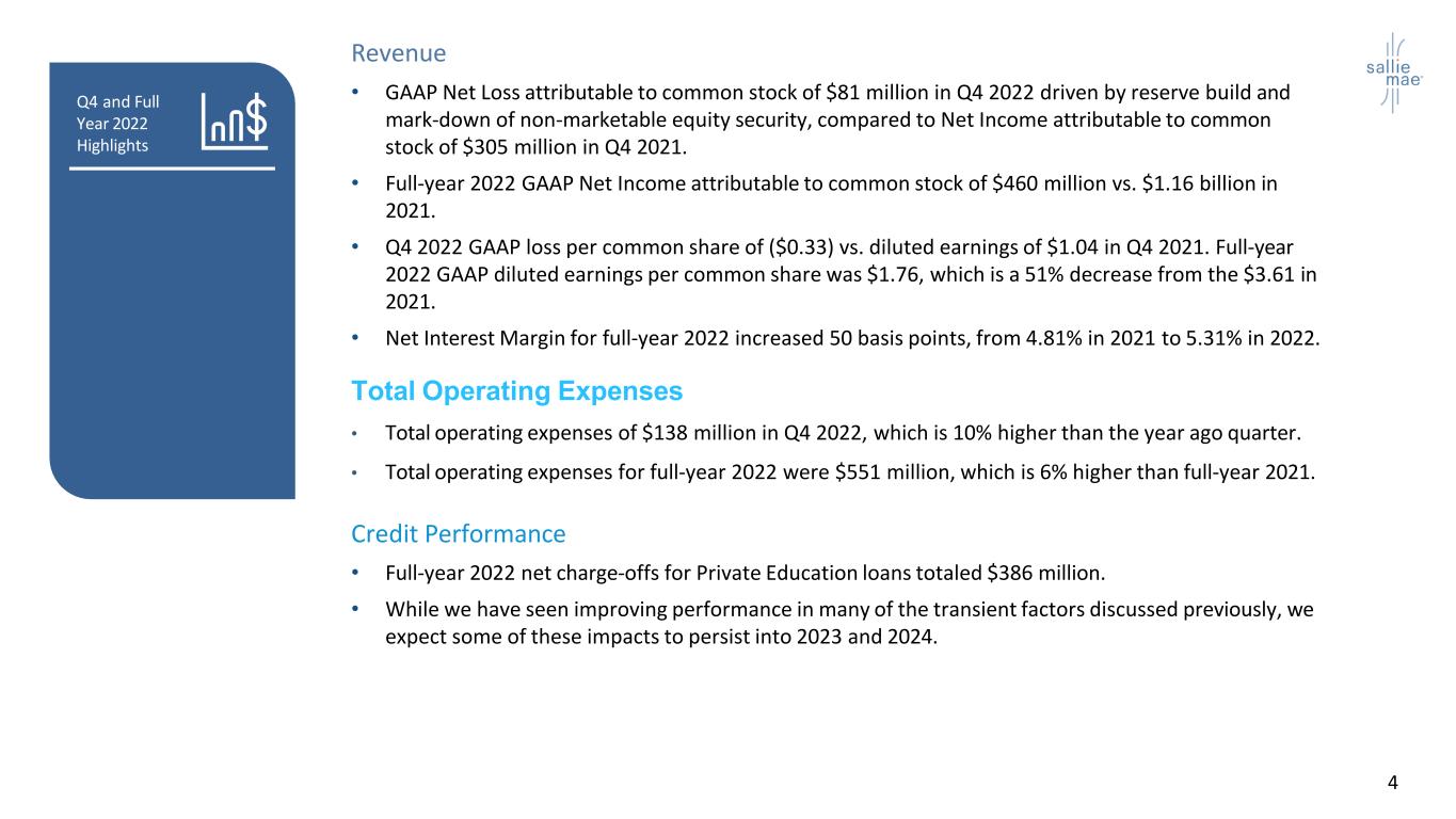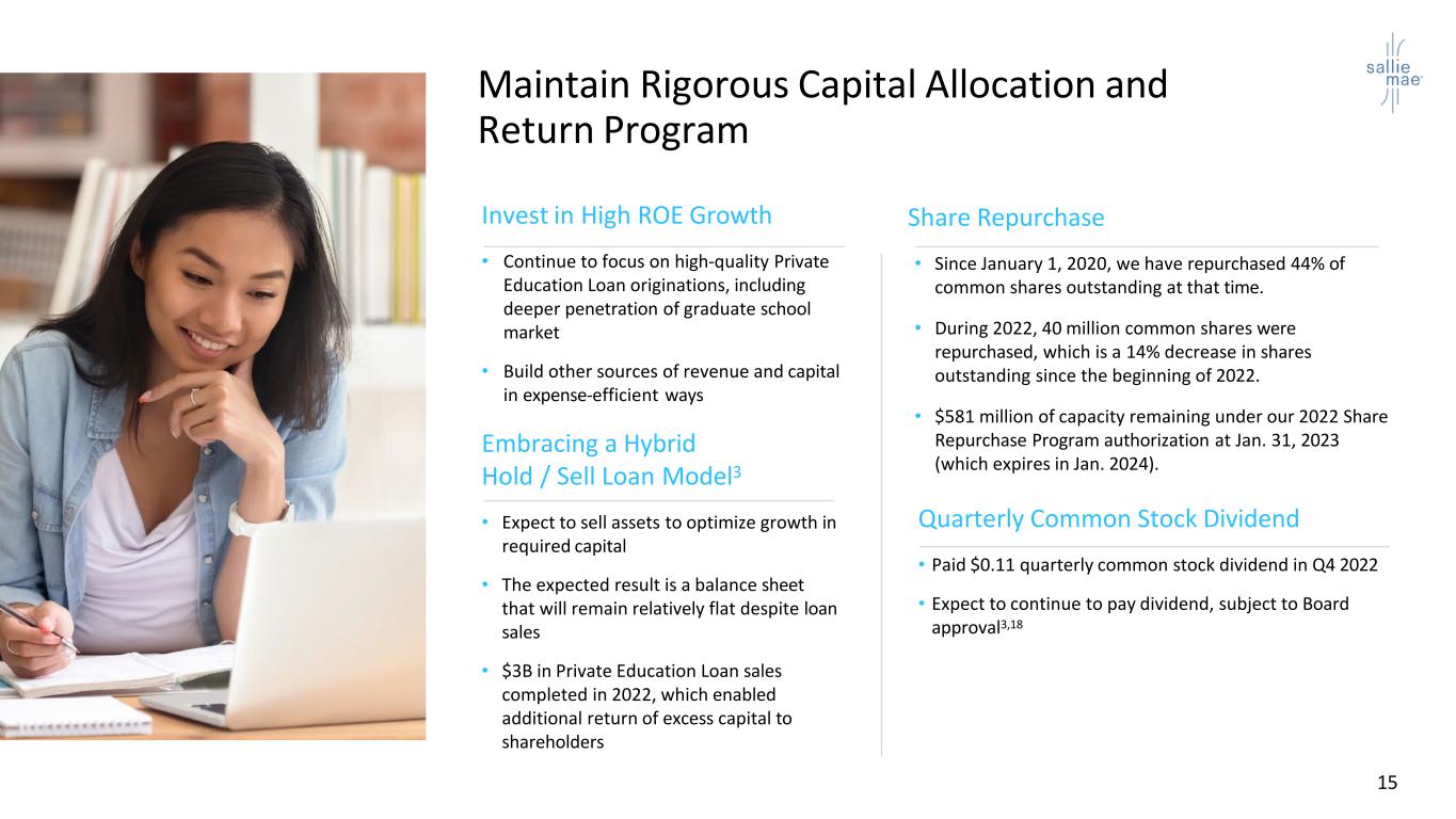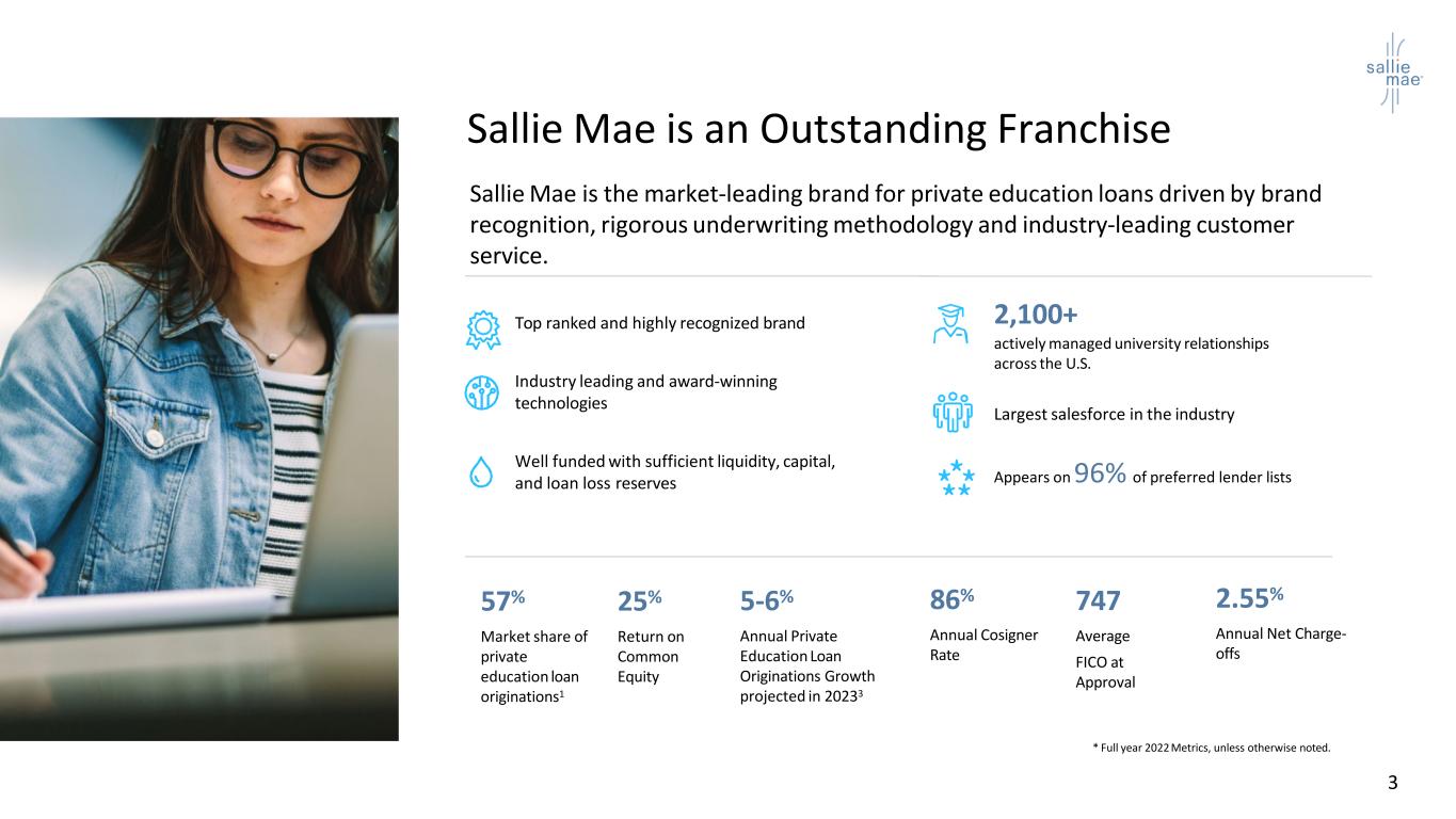 Forward-Looking Statements and Disclaimer Cautionary Note Regarding Forward-Looking Statements The following information is current as of February 1, 2023 (unless otherwise noted) and should be read in connection with the press release of SLM Corporation (the “Company”) announcing its financial results for the quarter and full year ended December 31, 2022, filed with the Securities and Exchange Commission (“SEC”) on February 1, 2023, and subsequent reports filed with the SEC. This Presentation contains “forward-looking” statements and information based on management’s current expectations as of the date of this Presentation. Statements that are not historical facts, including statements about the Company’s beliefs, opinions, or expectations and statements that assume or are dependent upon future events, are forward-looking statements. This includes, but is not limited to: statements regarding future developments surrounding COVID-19 or any other pandemic, including, without limitation, statements regarding the potential impact of COVID-19 or any other pandemic on the Company’s business, results of operations, financial condition, and/or cash flows; the Company’s expectation and ability to pay a quarterly cash dividend on its common stock in the future, subject to the determination by the Company’s Board of Directors, and based on an evaluation of the Company’s earnings, financial condition and requirements, business conditions, capital allocation determinations, and other factors, risks, and uncertainties; the Company’s 2023 guidance; the Company’s three-year horizon outlook; the Company’s expectation and ability to execute loan sales and share repurchases; the Company’s projections regarding originations, net charge-offs, non- interest expenses, earnings, balance sheet position, and other metrics; any estimates related to accounting standard changes; and any estimates related to the impact of credit administration practices changes, including the results of simulations or other behavioral observations. Forward-looking statements are subject to risks, uncertainties, assumptions, and other factors that may cause actual results to be materially different from those reflected in such forward-looking statements. These factors include, among others, the risks and uncertainties set forth in Item 1A. “Risk Factors” and elsewhere in the Company’s Annual Report on Form 10-K for the year ended Dec. 31, 2022 (filed with the SEC on Feb. 23, 2023) and subsequent filings with the SEC; the societal, business, and legislative/regulatory impact of pandemics and other public heath crises; increases in financing costs; limits on liquidity; increases in costs associated with compliance with laws and regulations; failure to comply with consumer protection, banking, and other laws; changes in accounting standards and the impact of related changes in significant accounting estimates, including any regarding the measurement of the Company’s allowance for credit losses and the related provision expense; any adverse outcomes in any significant litigation to which the Company or any subsidiary is a party; credit risk associated with the Company’s (or any subsidiary's) exposure to third parties, including counterparties to the Company’s (or any subsidiary's) derivative transactions; and changes in the terms of education loans and the educational credit marketplace (including changes resulting from new laws and the implementation of existing laws). The Company could also be affected by, among other things: changes in its funding costs and availability; reductions to its credit ratings; cybersecurity incidents, cyberattacks, and other failures or breaches of its operating systems or infrastructure, including those of third-party vendors; damage to its reputation; risks associated with restructuring initiatives, including failures to successfully implement cost-cutting programs and the adverse effects of such initiatives on the Company’s business; changes in the demand for educational financing or in financing preferences of lenders, educational institutions, students, and their families; changes in law and regulations with respect to the student lending business and financial institutions generally; changes in banking rules and regulations, including increased capital requirements; increased competition from banks and other consumer lenders; the creditworthiness of customers; changes in the general interest rate environment, including the rate relationships among relevant money-market instruments and those of earning assets versus funding arrangements; rates of prepayments on the loans owned by the Company and its subsidiaries; changes in general economic conditions and the Company’s ability to successfully effectuate any acquisitions; and other strategic initiatives. The preparation of the Company’s consolidated financial statements also requires management to make certain estimates and assumptions, including estimates and assumptions about future events. These estimates or assumptions may prove to be incorrect. All forward-looking statements contained in this Presentation are qualified by these cautionary statements and are made only as of the date of this Presentation. The Company does not undertake any obligation to update or revise these forward-looking statements to conform such statements to actual results or changes in its expectations. The Company reports financial results on a GAAP basis and also provides certain non-GAAP “Core Earnings” performance measures. The difference between the Company’s non-GAAP “Core Earnings” and GAAP results for the periods presented were the unrealized, mark-to-fair value gains/losses on derivative contracts (excluding current period accruals on the derivative instruments), net of tax. These are recognized in GAAP, but not in non-GAAP “Core Earnings” results. The Company provides non-GAAP “Core Earnings” becaus