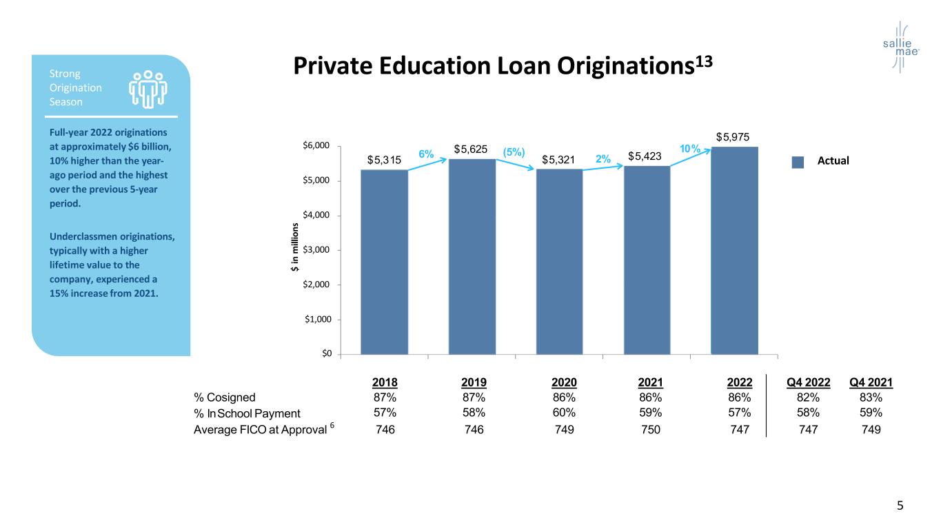 Revenue • GAAP Net Loss attributable to common stock of $81 million in Q4 2022 driven by reserve build and mark-down of non-marketable equity security, compared to Net Income attributable to common stock of $305 million in Q4 2021. • Full-year 2022 GAAP Net Income attributable to common stock of $460 million vs. $1.16 billion in 2021. • Q4 2022 GAAP loss per common share of ($0.33) vs. diluted earnings of $1.04 in Q4 2021. Full-year 2022 GAAP diluted earnings per common share was $1.76, which is a 51% decrease from the $3.61 in 2021. • Net Interest Margin for full-year 2022 increased 50 basis points, from 4.81% in 2021 to 5.31% in 2022. Total Operating Expenses • Total operating expenses of $138 million in Q4 2022, which is 10% higher than the year ago quarter. • Total operating expenses for full-year 2022 were $551 million, which is 6% higher than full-year 2021. Credit Performance • Full-year 2022 net charge-offs for Private Education loans totaled $386 million. • While we have seen improving performance in many of the transient factors discussed previously, we expect some of these impacts to persist into 2023 and 2024. Q4 and Full Year 2022 Highlights 4