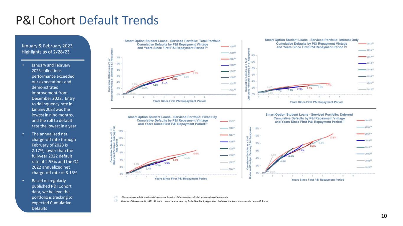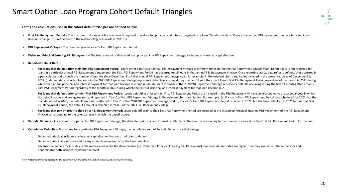 Smart Option Loan Program Cohort Default Triangles 20 Terms and calculations used in the cohort default triangles are defined below:  First P&I Repayment Period – The first month during which a borrower is required to make a full principal and interest payment on a loan. This date is static. Once a loan enters P&I repayment, the date is locked in and does not change. This refinement to the methodology was made in 2021 Q2.  P&I Repayment Vintage – The calendar year of a loan’s First P&I Repayment Period.  Disbursed Principal Entering P&I Repayment – The total amount of disbursed loan principal in a P&I Repayment Vintage, excluding any interest capitalization.  Reported Default Data – o For loans that default after their First P&I Repayment Period: Loans enter a particular annual P&I Repayment Vintage at different times during the P&I Repayment Vintage year. Default data is not reported for loans in a particular annual P&I Repayment Vintage until the First P&I Repayment Period has occurred for all loans in that annual P&I Repayment Vintage. Once reporting starts, data reflects defaults that occurred in a particular period through the number of months since December 31 of that annual P&I Repayment Vintage year. For example, in the relevant charts and tables included in this presentation as of December 31, 2022: (i) default data reported for loans in the 2021 P&I Repayment Vintage represents defaults occurring during the first 12 months after a loan’s First P&I Repayment Period regardless of the month in 2021 during which the first full principal and interest payment for that loan became due; and (ii) default data for loans in the 2020 P&I Repayment Vintage represents defaults occurring during the first 24 months after a loan’s First P&I Repayment Period regardless of the month in 2020 during which the first full principal and interest payment for that loan became due. o For loans that default prior to their First P&I Repayment Period: Loans defaulting prior to their First P&I Repayment Period are included in the P&I Repayment Vintage corresponding to the calendar year in which the default occurs and are aggregated and reported in Year 0 of that P&I Repayment Vintage in the relevant charts and tables. For example: (a) if a loan’s First P&I Repayment Period was scheduled for 2021, but the loan defaulted in 2020, the default amount is reflected in Year 0 of the 2020 P&I Repayment Vintage; and (b) if a loan’s First P&I Repayment Period occurred in 2022, but the loan defaulted in 2021 before that First P&I Repayment Period, the default amount is reflected in Year 0 of the 2021 P&I Repayment Vintage. o For loans that pay off prior to their First P&I Repayment Period: Loans paid off prior to their First P&I Repayment Period are included in the Disbursed Principal Entering P&I Repayment of the P&I Repayment Vintage corresponding to the calendar year in which the payoff occurs.  Periodic Defaults – For any loan in a particular P&I Repayment Vintage, the defaulted principal and interest is reflected in the year corresponding to the number of years since the First P&I Repayment Period for that loan.  Cumulative Defaults – At any time for a particular P&I Repayment Vintage, the cumulative sum of Periodic Defaults for that vintage. o Defaulted principal includes any interest capitalization that occurred prior to default o Defaulted principal is not reduced by any amounts recovered after the loan defaulted o Because the numerator includes capitalized interest while the denominator (i.e., Disbursed Principal Entering P&I Repayment) does not, default rates are higher than they would be if the numerator and denominator both included capitalized interest Note: Historical trends suggested by the cohort default triangles may not be indicative of future performance.