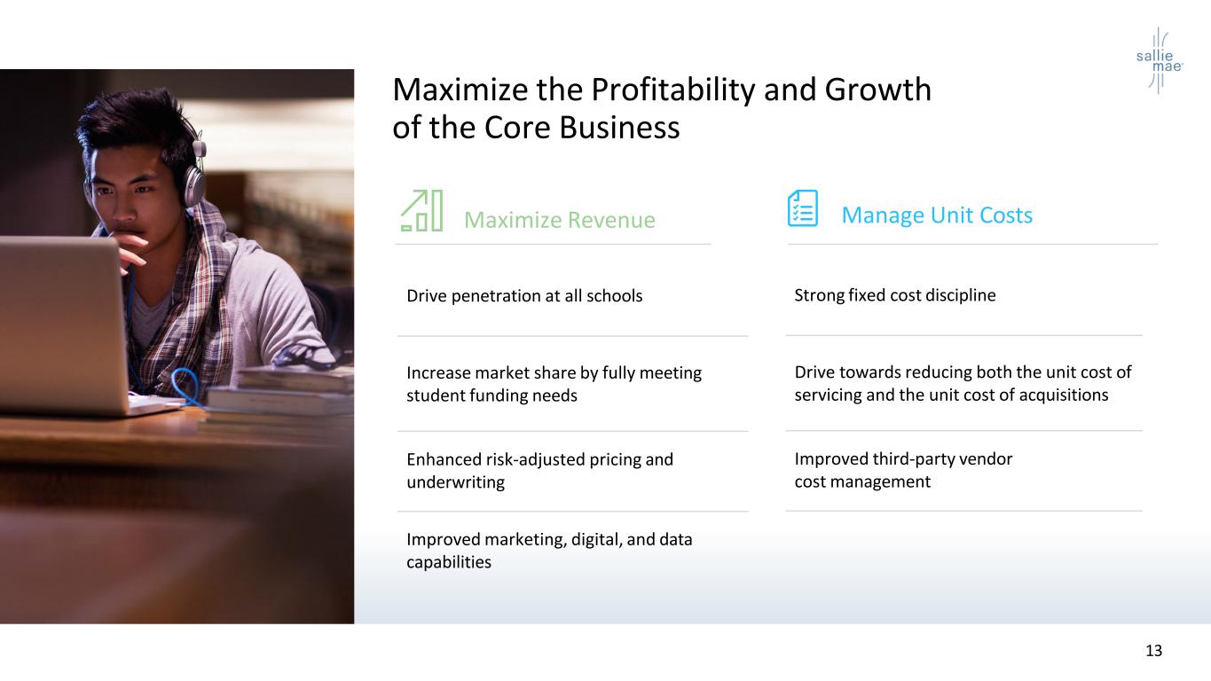 Clear Strategy to Prove this Investment Thesis Maximize the profitability and growth of our core business 3. Better inform the external narrative about private student lending and Sallie Mae 2. Maximize the value of our brand and attractive customer base 4. Maintain a rigorous and predictable capital allocation and return program to create shareholder value 1. 12 Strategic Imperatives: