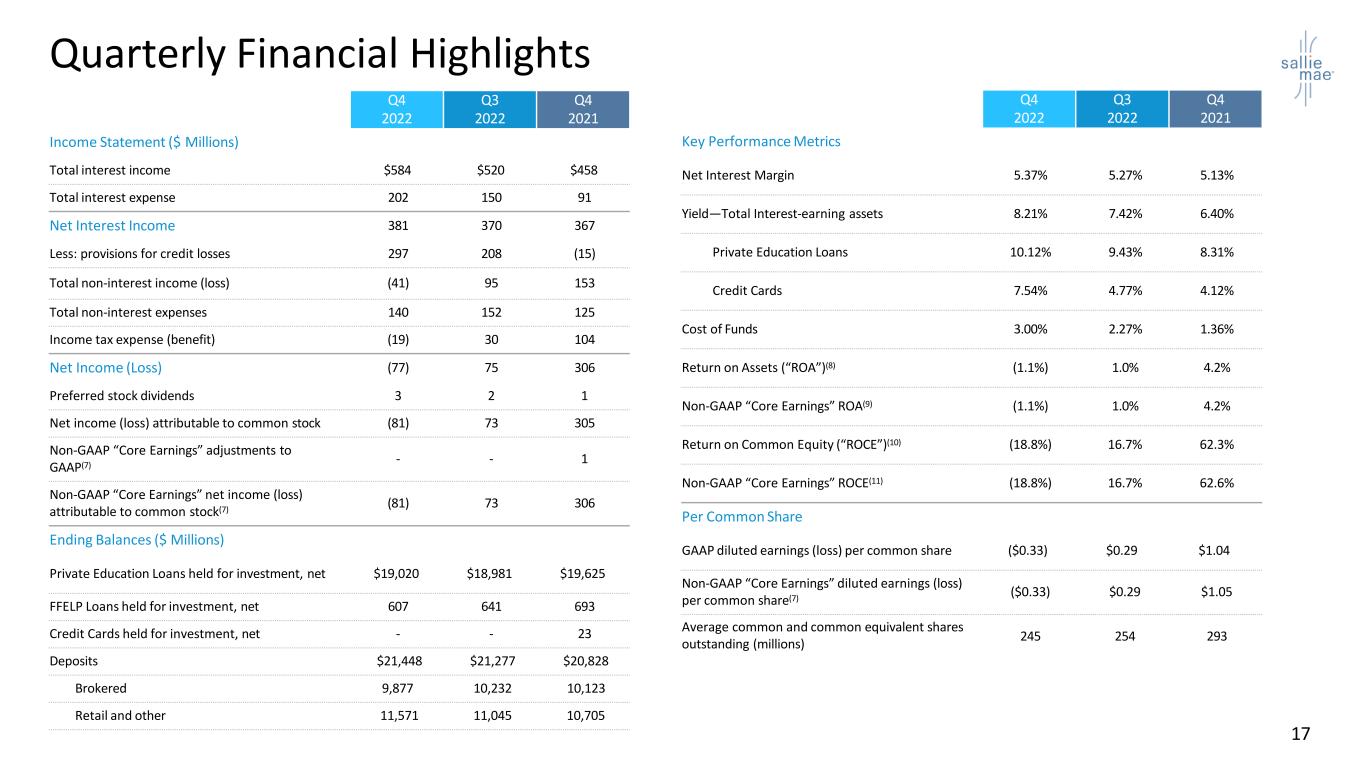 2022 2021 Key Performance Metrics Net Interest Margin 5.31% 4.81% Yield—Total Interest-earning assets 7.24% 6.13% Private Education Loans 9.14% 8.25% Credit Cards 5.10% 4.67% Cost of Funds 2.05% 1.42% Return on Assets (“ROA”)(8) 1.6% 3.9% Non-GAAP “Core Earnings” ROA(9) 1.6% 4.0% Return on Common Equity (“ROCE”)(10) 25.4% 53.9% Non-GAAP “Core Earnings” ROCE(11) 25.4% 54.7% Per Common Share GAAP diluted earnings per common share $1.76 $3.61 Non-GAAP “Core Earnings” diluted earnings per common share(7) $1.76 $3.67 Average common and common equivalent shares outstanding (millions) 262 320 18 Annual Financial Highlights 2022 2021 Income Statement ($ Millions) Total interest income $2,032 $1,777 Total interest expense 543 382 Net Interest Income 1,489 1,395 Less: provisions for credit losses 633 (33) Total non-interest income 335 632 Total non-interest expenses 559 520 Income tax expense 162 380 Net Income 469 1,161 Preferred stock dividends 9 5 Net income attributable to common stock 460 1,156 Non-GAAP “Core Earnings” adjustments to GAAP(7) - 18 Non-GAAP “Core Earnings” net income attributable to common stock(7) 460 1,173 Ending Balances ($ Millions) Private Education Loans held for investment, net $19,020 $19,625 FFELP Loans held for investment, net 607 693 Credit Cards held for investment, net - 23 Deposits $21,448 $20,828 Brokered 9,877 10,123 Retail and other 11,571 10,705