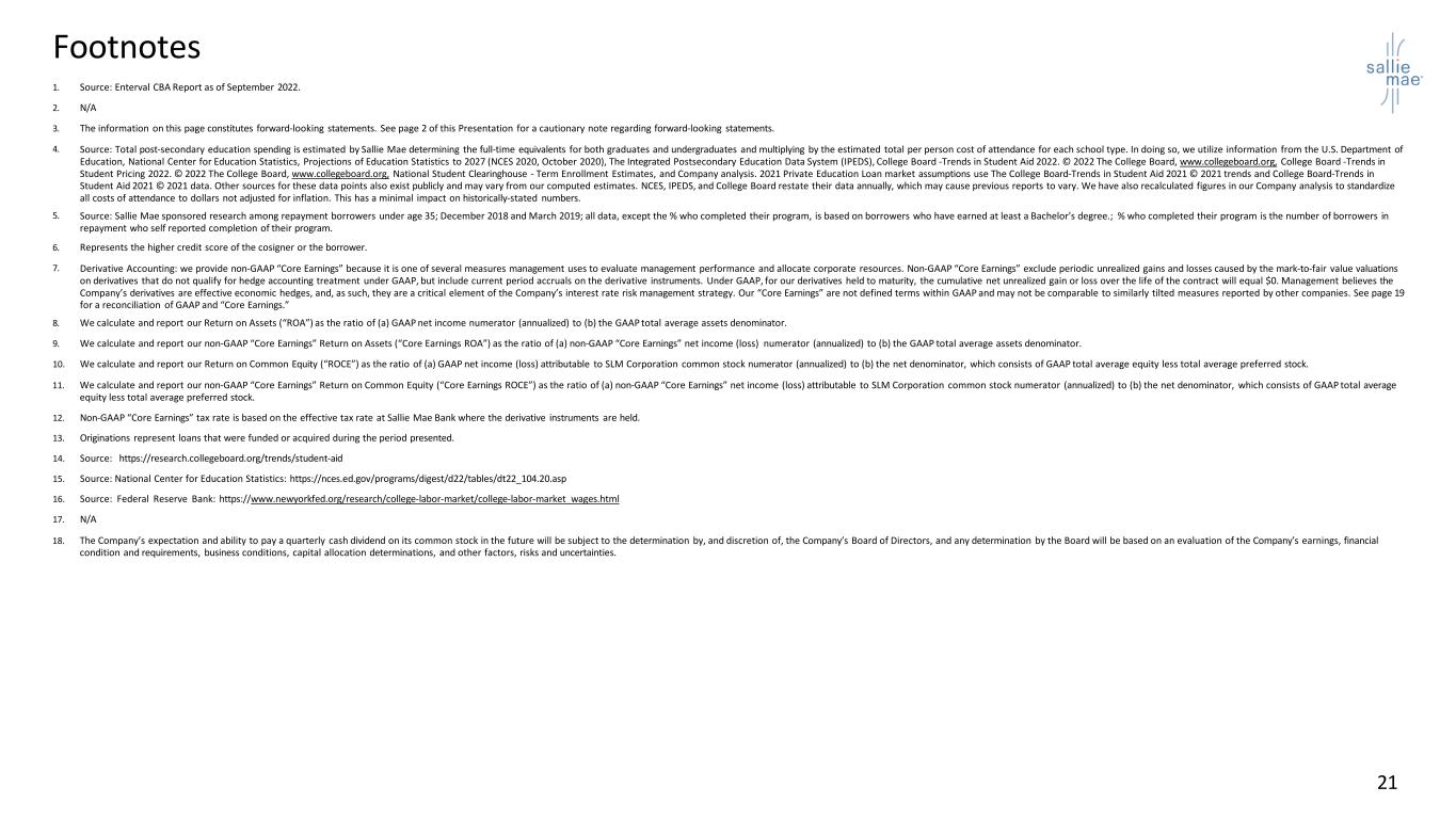 21 Footnotes 1. Source: Enterval CBA Report as of September 2022. 2. N/A 3. The information on this page constitutes forward-looking statements. See page 2 of this Presentation for a cautionary note regarding forward-looking statements. Source: Total post-secondary education spending is estimated by Sallie Mae determining the full-time equivalents for both graduates and undergraduates and multiplying by the estimated total per person cost of attendance for each school type. In doing so, we utilize information from the U.S. Department of Education, National Center for Education Statistics, Projections of Education Statistics to 2027 (NCES 2020, October 2020), The Integrated Postsecondary Education Data System (IPEDS), College Board -Trends in Student Aid 2022. © 2022 The College Board, www.collegeboard.org, College Board -Trends in Student Pricing 2022. © 2022 The College Board, www.collegeboard.org, National Student Clearinghouse - Term Enrollment Estimates, and Company analysis. 2021 Private Education Loan market assumptions use The College Board-Trends in Student Aid 2021 © 2021 trends and College Board-Trends in Student Aid 2021 © 2021 data. Other sources for these data points also exist publicly and may vary from our computed estimates. NCES, IPEDS, and College Board restate their data annually, which may cause previous reports to vary. We have also recalculated figures in our Company analysis to standardize all costs of attendance to dollars not adjusted for inflation. This has a minimal impact on historically-stated numbers. 4. 5. Source: Sallie Mae sponsored research among repayment borrowers under age 35; December 2018 and March 2019; all data, except the % who completed their program, is based on borrowers who have earned at least a Bachelor's degree.; % who completed their program is the number of borrowers in repayment who self reported completion of their program. 6. Represents the higher credit score of the cosigner or the borrower. 7. Derivative Accounting: we provide non-GAAP “Core Earnings” because it is one of several measures management uses to evaluate management performance and allocate corporate resources. Non-GAAP “Core Earnings” exclude periodic unrealized gains and losses caused by the mark-to-fair value valuations on derivatives that do not qualify for hedge accounting treatment under GAAP, but include current period accruals on the derivative instruments. Under GAAP, for our derivatives held to maturity, the cumulative net unrealized gain or loss over the life of the contract will equal $0. Management believes the Company’s derivatives are effective economic hedges, and, as such, they are a critical element of the Company’s interest rate risk management strategy. Our “Core Earnings” are not defined terms within GAAP and may not be comparable to similarly tilted measures reported by other companies. See page 19 for a reconciliation of GAAP and “Core Earnings.” 8. We calculate and report our Return on Assets (“ROA”) as the ratio of (a) GAAP net income numerator (annualized) to (b) the GAAP total average assets denominator. 9. We calculate and report our non-GAAP “Core Earnings” Return on Assets (“Core Earnings ROA”) as the ratio of (a) non-GAAP “Core Earnings” net income (loss) numerator (annualized) to (b) the GAAP total average assets denominator. 10. We calculate and report our Return on Common Equity (“ROCE”) as the ratio of (a) GAAP net income (loss) attributable to SLM Corporation common stock numerator (annualized) to (b) the net denominator, which consists of GAAP total average equity less total average preferred stock. 11. We calculate and report our non-GAAP “Core Earnings” Return on Common Equity (“Core Earnings ROCE”) as the ratio of (a) non-GAAP “Core Earnings” net income (loss) attributable to SLM Corporation common stock numerator (annualized) to (b) the net denominator, which consists of GAAP total average equity less total average preferred stock. 12. Non-GAAP “Core Earnings” tax rate is based on the effective tax rate at Sallie Mae Bank where the derivative instruments are held. 13. Originations represent loans that were funded or acquired during the period presented. 14. Source: https://research.collegeboard.org/trends/student-aid 15. Source: National Center for Education Statistics: https://nces.ed.gov/programs/digest/d22/tables/dt22_104.20.asp 16. Source: Federal Reserve Bank: https://www.newyorkfed.org/research/college-labor-market/college-labor-market_wages.html 17. N/A 18. The Company’s expectation and ability to pay a quarterly cash dividend on its common stock in the future will be subject to the determination by, and discretion of, the Company’s Board of Directors, and any determination by the Board will be based on an evaluation of the Company’s earnings, financial condition and requirements, business conditions, capital allocation determinations, and other factors, risks and uncertainties.