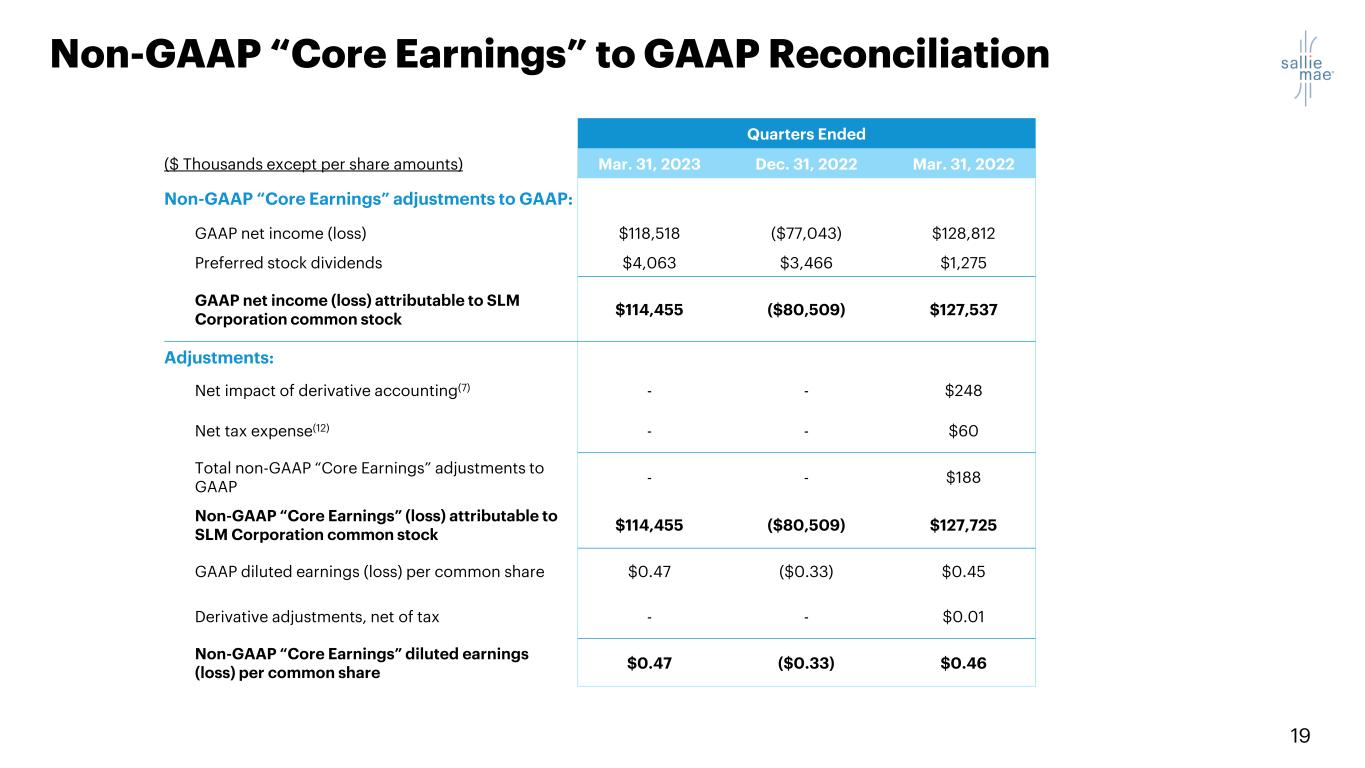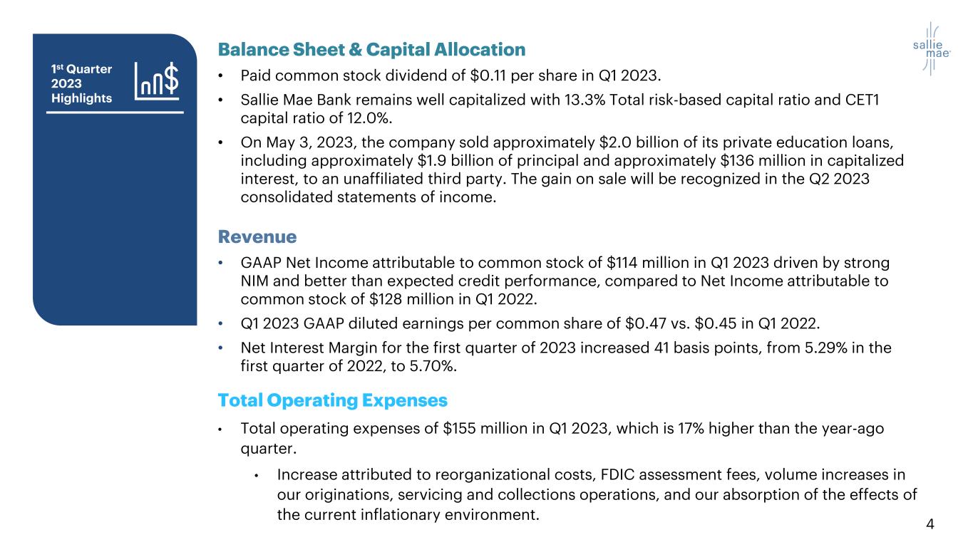 2 Forward-Looking Statements and Disclaimer Cautionary Note Regarding Forward-Looking Statements The following information is current as of April 26, 2023 (unless otherwise noted) and should be read in connection with the press release of SLM Corporation (the “Company”) announcing its financial results for the quarter ended March 31, 2023, the Form 10-Q for the quarter ended March 31, 2023, filed with the Securities and Exchange Commission (“SEC”) on April 26, 2023, and subsequent reports filed with the SEC. This Presentation contains “forward-looking” statements and information based on management’s current expectations as of the date of this Presentation. Statements that are not historical facts, including statements about the Company’s beliefs, opinions, or expectations and statements that assume or are dependent upon future events, are forward-looking statements. This includes, but is not limited to: statements regarding future developments surrounding COVID-19 or any other pandemic, including, without limitation, statements regarding the potential impact of COVID-19 or any other pandemic on the Company’s business, results of operations, financial condition, and/or cash flows; the Company’s expectation and ability to pay a quarterly cash dividend on its common stock in the future, subject to the determination by the Company’s Board of Directors, and based on an evaluation of the Company’s earnings, financial condition and requirements, business conditions, capital allocation determinations, and other factors, risks, and uncertainties; the Company’s 2023 guidance; the Company’s three-year horizon outlook; the Company’s expectation and ability to execute loan sales and share repurchases; the Company’s projections regarding originations, net charge-offs, non-interest expenses, earnings, balance sheet position, and other metrics; any estimates related to accounting standard changes; and any estimates related to the impact of credit administration practices changes, including the results of simulations or other behavioral observations. Forward-looking statements are subject to risks, uncertainties, assumptions, and other factors that may cause actual results to be materially different from those reflected in such forward-looking statements. These factors include, among others, the risks and uncertainties set forth in Item 1A. “Risk Factors” and elsewhere in the Company’s Annual Report on Form 10-K for the year ended Dec. 31, 2022 (filed with the SEC on Feb. 23, 2023) and subsequent filings with the SEC; the societal, business, and legislative/regulatory impact of pandemics and other public heath crises; increases in financing costs; limits on liquidity; increases in costs associated with compliance with laws and regulations; failure to comply with consumer protection, banking, and other laws; changes in accounting standards and the impact of related changes in significant accounting estimates, including any regarding the measurement of the Company’s allowance for credit losses and the related provision expense; any adverse outcomes in any significant litigation to which the Company or any subsidiary is a party; credit risk associated with the Company’s (or any subsidiary's) exposure to third parties, including counterparties to the Company’s (or any subsidiary's) derivative transactions; and changes in the terms of education loans and the educational credit marketplace (including changes resulting from new laws and the implementation of existing laws). The Company could also be affected by, among other things: changes in its funding costs and availability; reductions to its credit ratings; cybersecurity incidents, cyberattacks, and other failures or breaches of its operating systems or infrastructure, including those of third-party vendors; damage to its reputation; risks associated with restructuring initiatives, including failures to successfully implement cost-cutting programs and the adverse effects of such initiatives on the Company’s business; changes in the demand for educational financing or in financing preferences of lenders, educational institutions, students, and their families; changes in law and regulations with respect to the student lending business and financial institutions generally; changes in banking rules and regulations, including increased capital requirements; increased competition from banks and other consumer lenders; the creditworthiness of customers; changes in the general interest rate environment, including the rate relationships among relevant money-market instruments and those of earning assets versus funding arrangements; rates of prepayments on the loans owned by the Company and its subsidiaries; changes in general economic conditions and the Company’s ability to successfully effectuate any acquisitions; and other strategic initiatives. The preparation of the Company’s consolidated financial statements also requires management to make certain estimates and assumptions, including estimates and assumptions about future events. These estimates or assumptions may prove to be incorrect. All forward-looking statements contained in this Presentation are qualified by these cautionary statements and are made only as of the date of this Presentation. The Company does not undertake any obligation to update or revise these forward-looking statements to conform such statements to actual results or changes in its expectations. The Company reports financial results on a GAAP basis and also provides certain non-GAAP “Core Earnings” performance measures. The difference between the Company’s non-GAAP “Core Earnings” and GAAP results for the periods presented were the unrealized, mark-to-fair value gains/losses on derivative contracts (excluding current period accruals on the derivative instruments), net of tax. These are recognized in GAAP, but not in non-GAAP “Core Earnings” results. The Company provides non