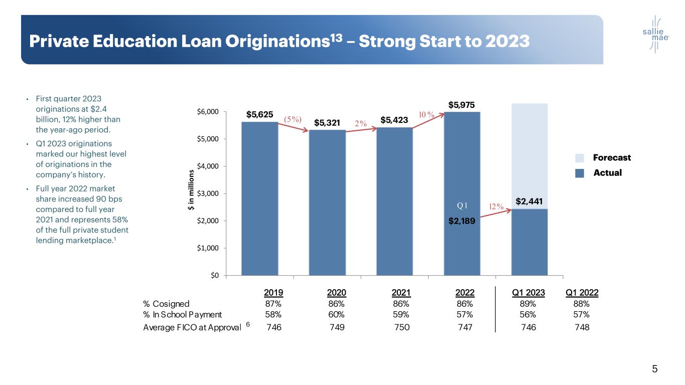 4 Balance Sheet & Capital Allocation • Paid common stock dividend of $0.11 per share in Q1 2023. • Sallie Mae Bank remains well capitalized with 13.3% Total risk-based capital ratio and CET1 capital ratio of 12.0%. • On May 3, 2023, the company sold approximately $2.0 billion of its private education loans, including approximately $1.9 billion of principal and approximately $136 million in capitalized interest, to an unaffiliated third party. The gain on sale will be recognized in the Q2 2023 consolidated statements of income. Revenue • GAAP Net Income attributable to common stock of $114 million in Q1 2023 driven by strong NIM and better than expected credit performance, compared to Net Income attributable to common stock of $128 million in Q1 2022. • Q1 2023 GAAP diluted earnings per common share of $0.47 vs. $0.45 in Q1 2022. • Net Interest Margin for the first quarter of 2023 increased 41 basis points, from 5.29% in the first quarter of 2022, to 5.70%. Total Operating Expenses • Total operating expenses of $155 million in Q1 2023, which is 17% higher than the year-ago quarter. • Increase attributed to reorganizational costs, FDIC assessment fees, volume increases in our originations, servicing and collections operations, and our absorption of the effects of the current inflationary environment. 1st Quarter 2023 Highlights