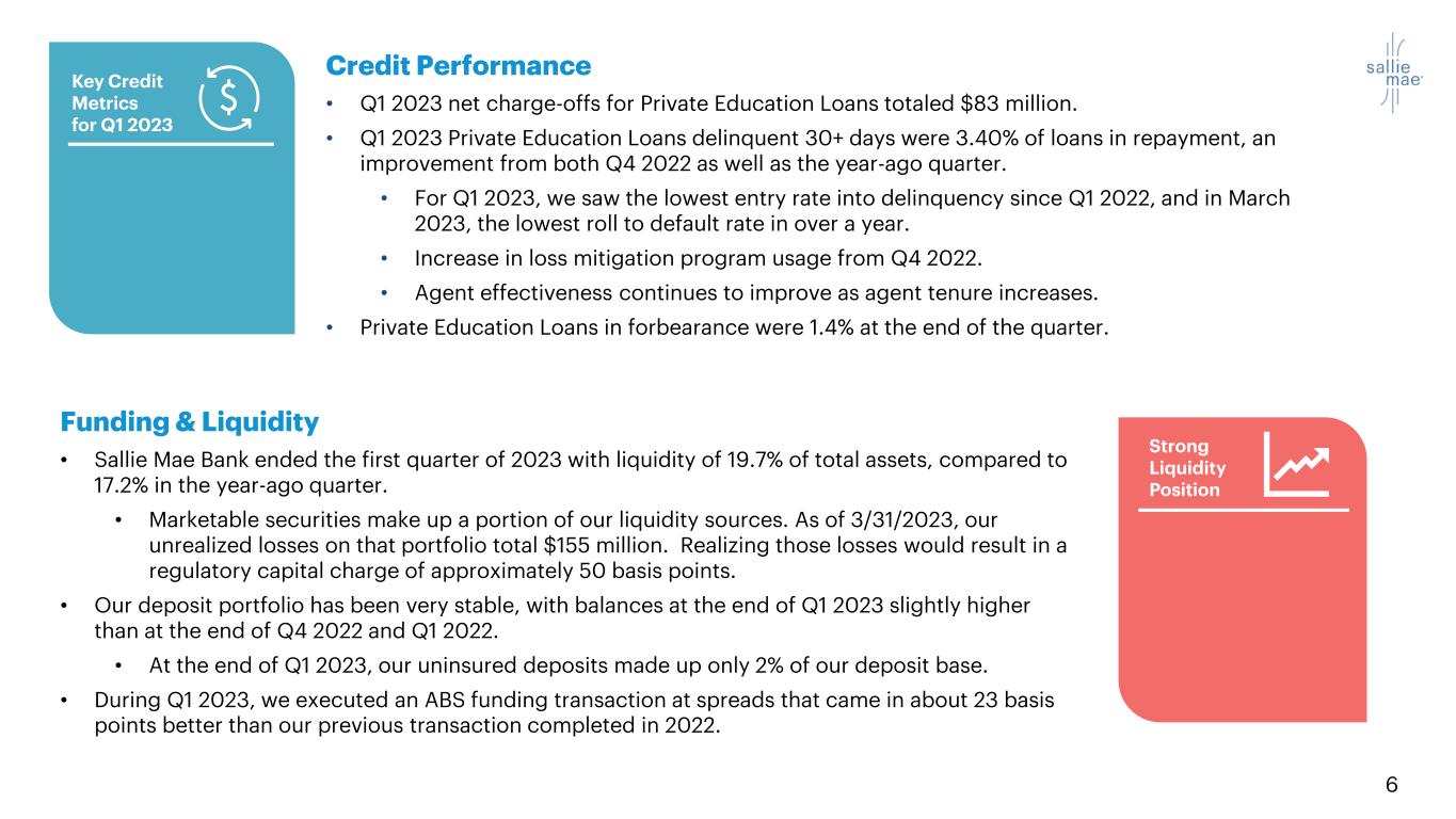 5 Actual 2019 87% 58% 746 2020 86% 60% 749 2021 86% 59% 750 Private Education Loan Originations13 – Strong Start to 2023 • First quarter 2023 originations at $2.4 billion, 12% higher than the year-ago period. • Q1 2023 originations marked our highest level of originations in the company’s history. • Full year 2022 market share increased 90 bps compared to full year 2021 and represents 58% of the full private student lending marketplace.1 Forecast 2022 86% 57% 747 Q1 2023 89% 56% 746 Q1 2022 88% 57% 748 % Cosigned % In School Payment Average FICO at Approval9 $5,625 $5,321 $5,423 $5,975 $2,441 $0 $1,000 $2,000 $3,000 $4,000 $5,000 $6,000 $ in m ill io ns (5%) 2% 12% 10 % $2,189 Q1 6