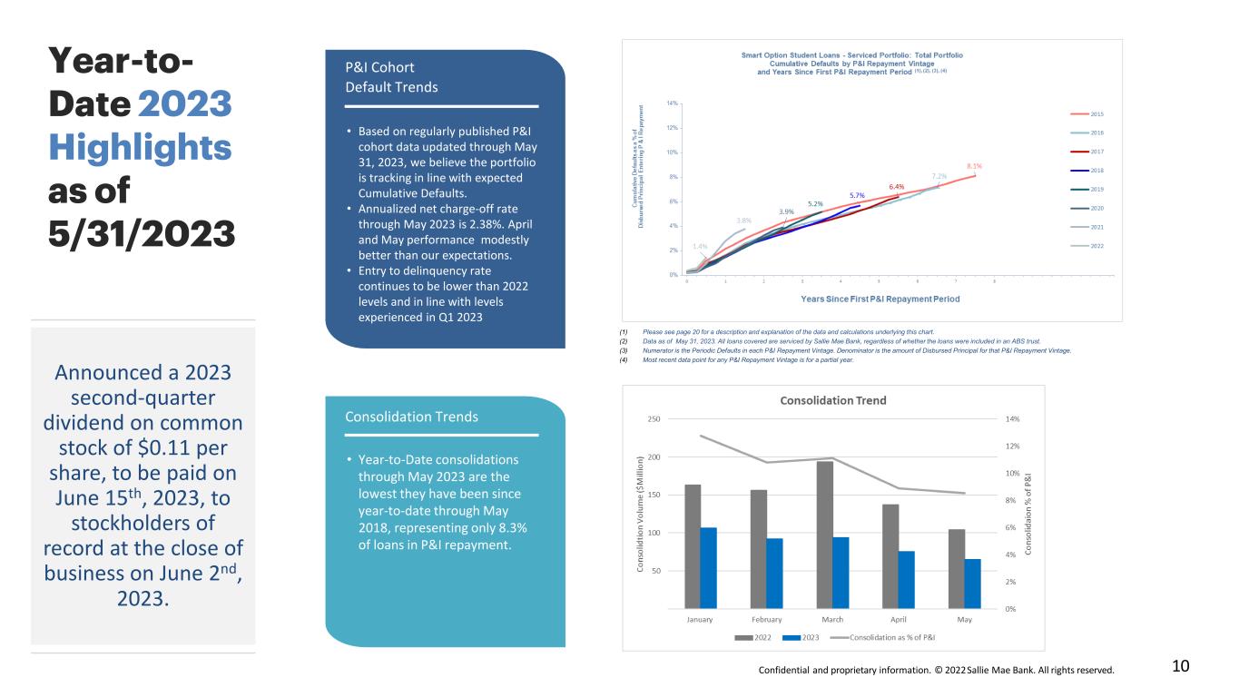 Confidential and proprietary information. © 2022Sallie Mae Bank. All rights reserved. 10 Year-to- Date 2023 Highlights as of 5/31/2023 P&I Cohort Default Trends • Based on regularly published P&I cohort data updated through May 31, 2023, we believe the portfolio is tracking in line with expected Cumulative Defaults. • Annualized net charge-off rate through May 2023 is 2.38%. April and May performance modestly better than our expectations. • Entry to delinquency rate continues to be lower than 2022 levels and in line with levels experienced in Q1 2023 Consolidation Trends • Year-to-Date consolidations through May 2023 are the lowest they have been since year-to-date through May 2018, representing only 8.3% of loans in P&I repayment. Announced a 2023 second-quarter dividend on common stock of $0.11 per share, to be paid on June 15th, 2023, to stockholders of record at the close of business on June 2nd, 2023. (1) Please see page 20 for a description and explanation of the data and calculations underlying this chart. (2) Data as of May 31, 2023. All loans covered are serviced by Sallie Mae Bank, regardless of whether the loans were included in an ABS trust. (3) Numerator is the Periodic Defaults in each P&I Repayment Vintage. Denominator is the amount of Disbursed Principal for that P&I Repayment Vintage. (4) Most recent data point for any P&I Repayment Vintage is for a partial year.