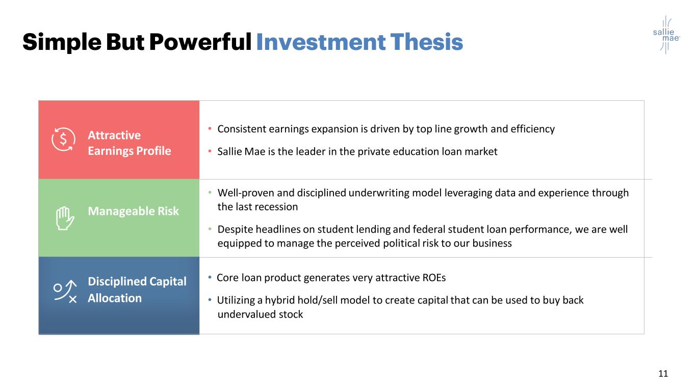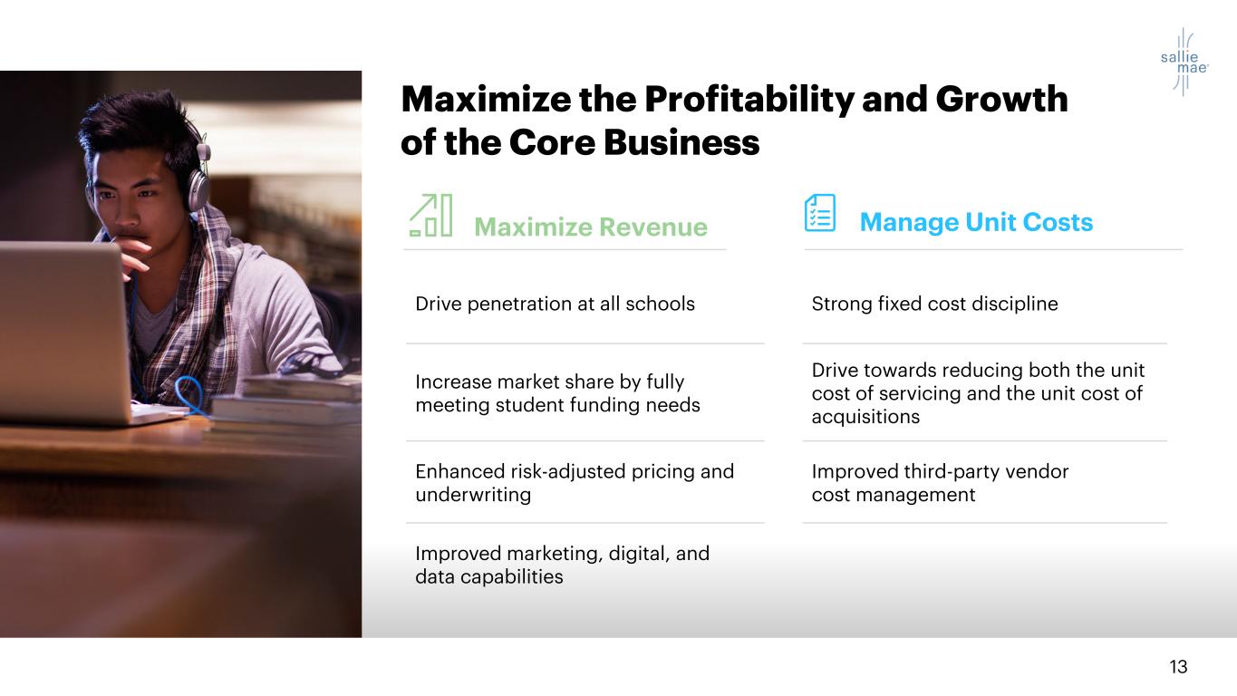 Clear Strategy to Prove this Investment Thesis Maximize the profitability and growth of our core business 3. Better inform the external narrative about private student lending and Sallie Mae 2. Maximize the value of our brand and attractive customer base 4. Maintain a rigorous and predictable capital allocation and return program to create shareholder value 1. 12 Strategic Imperatives: