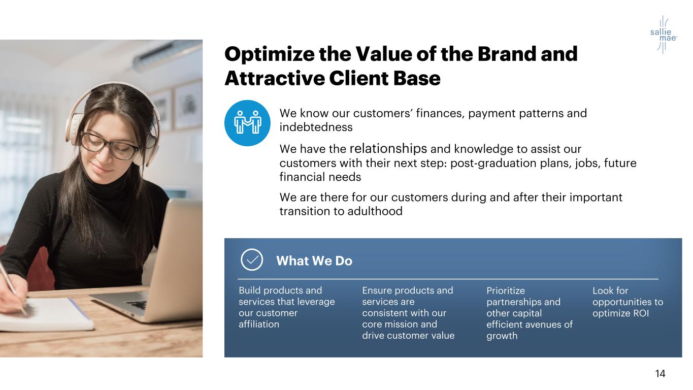 13 Maximize the Profitability and Growth of the Core Business Maximize Revenue Manage Unit Costs Drive penetration at all schools Increase market share by fully meeting student funding needs Enhanced risk-adjusted pricing and underwriting Improved marketing, digital, and data capabilities Strong fixed cost discipline Drive towards reducing both the unit cost of servicing and the unit cost of acquisitions Improved third-party vendor cost management