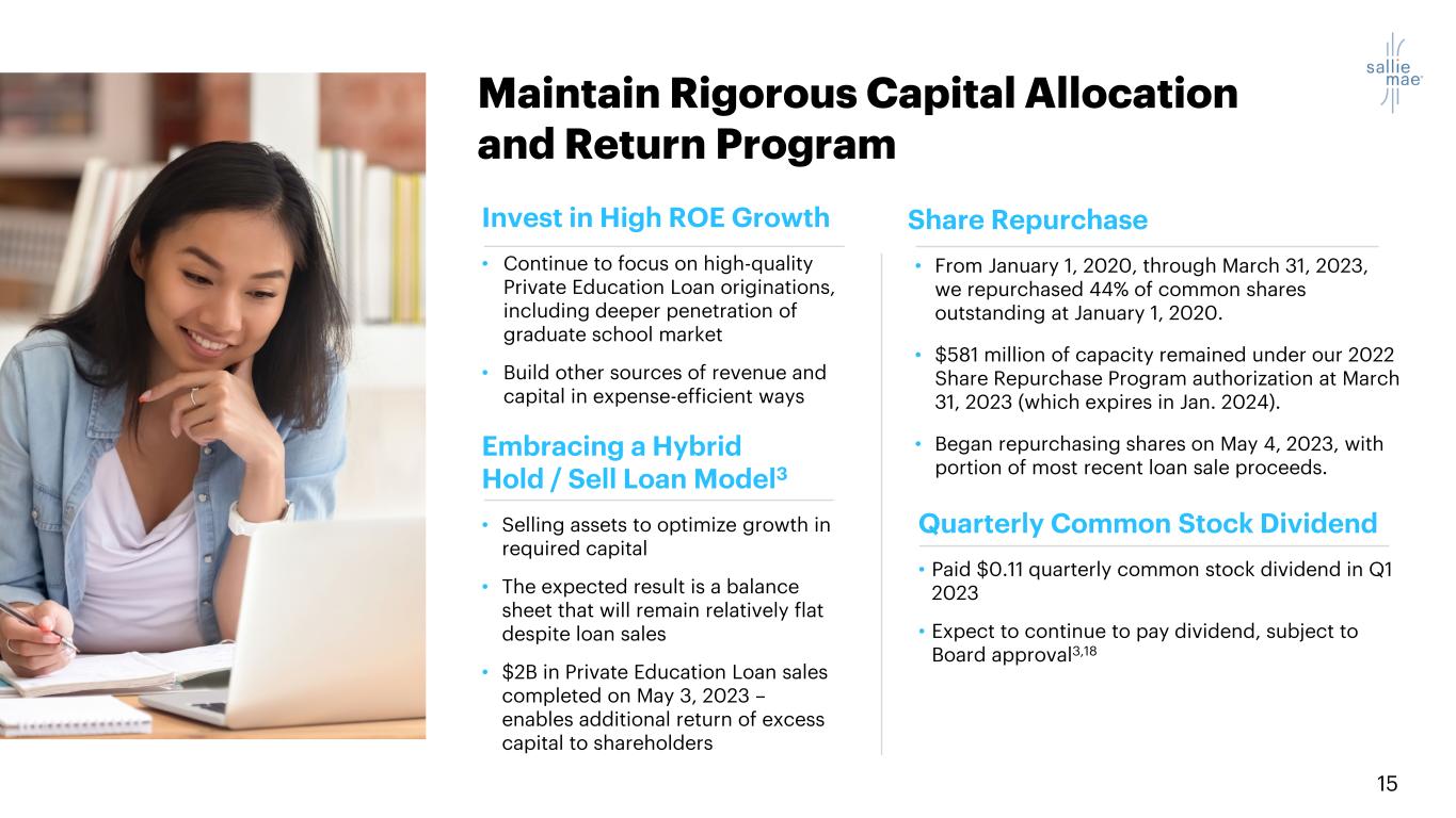 15 Maintain Rigorous Capital Allocation and Return Program Invest in High ROE Growth • Continue to focus on high-quality Private Education Loan originations, including deeper penetration of graduate school market • Build other sources of revenue and capital in expense-efficient ways Quarterly Common Stock Dividend • Paid $0.11 quarterly common stock dividend in Q1 2023 • Expect to continue to pay dividend, subject to Board approval3,18 Share Repurchase • From January 1, 2020, through March 31, 2023, we repurchased 44% of common shares outstanding at January 1, 2020. • $581 million of capacity remained under our 2022 Share Repurchase Program authorization at March 31, 2023 (which expires in Jan. 2024). • Began repurchasing shares on May 4, 2023, with portion of most recent loan sale proceeds. We allocate capital with discipline Embracing a Hybrid Hold / Sell Loan Model3 • Selling assets to optimize growth in required capital • The expected result is a balance sheet that will remain relatively flat despite loan sales • $2B in Private Education Loan sales completed on May 3, 2023 – enables additional return of excess capital to shareholders