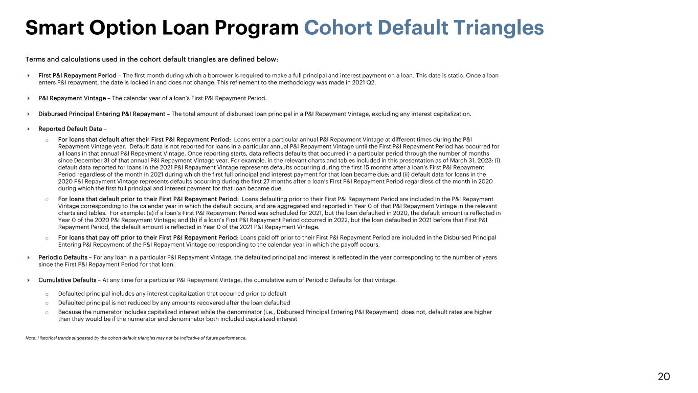 20 Smart Option Loan Program Cohort Default Triangles Terms and calculations used in the cohort default triangles are defined below:  First P&I Repayment Period – The first month during which a borrower is required to make a full principal and interest payment on a loan. This date is static. Once a loan enters P&I repayment, the date is locked in and does not change. This refinement to the methodology was made in 2021 Q2.  P&I Repayment Vintage – The calendar year of a loan’s First P&I Repayment Period.  Disbursed Principal Entering P&I Repayment – The total amount of disbursed loan principal in a P&I Repayment Vintage, excluding any interest capitalization.  Reported Default Data – o For loans that default after their First P&I Repayment Period: Loans enter a particular annual P&I Repayment Vintage at different times during the P&I Repayment Vintage year. Default data is not reported for loans in a particular annual P&I Repayment Vintage until the First P&I Repayment Period has occurred for all loans in that annual P&I Repayment Vintage. Once reporting starts, data reflects defaults that occurred in a particular period through the number of months since December 31 of that annual P&I Repayment Vintage year. For example, in the relevant charts and tables included in this presentation as of March 31, 2023: (i) default data reported for loans in the 2021 P&I Repayment Vintage represents defaults occurring during the first 15 months after a loan’s First P&I Repayment Period regardless of the month in 2021 during which the first full principal and interest payment for that loan became due; and (ii) default data for loans in the 2020 P&I Repayment Vintage represents defaults occurring during the first 27 months after a loan’s First P&I Repayment Period regardless of the month in 2020 during which the first full principal and interest payment for that loan became due. o For loans that default prior to their First P&I Repayment Period: Loans defaulting prior to their First P&I Repayment Period are included in the P&I Repayment Vintage corresponding to the calendar year in which the default occurs, and are aggregated and reported in Year 0 of that P&I Repayment Vintage in the relevant charts and tables. For example: (a) if a loan’s First P&I Repayment Period was scheduled for 2021, but the loan defaulted in 2020, the default amount is reflected in Year 0 of the 2020 P&I Repayment Vintage; and (b) if a loan’s First P&I Repayment Period occurred in 2022, but the loan defaulted in 2021 before that First P&I Repayment Period, the default amount is reflected in Year 0 of the 2021 P&I Repayment Vintage. o For loans that pay off prior to their First P&I Repayment Period: Loans paid off prior to their First P&I Repayment Period are included in the Disbursed Principal Entering P&I Repayment of the P&I Repayment Vintage corresponding to the calendar year in which the payoff occurs.  Periodic Defaults – For any loan in a particular P&I Repayment Vintage, the defaulted principal and interest is reflected in the year corresponding to the number of years since the First P&I Repayment Period for that loan.  Cumulative Defaults – At any time for a particular P&I Repayment Vintage, the cumulative sum of Periodic Defaults for that vintage. o Defaulted principal includes any interest capitalization that occurred prior to default o Defaulted principal is not reduced by any amounts recovered after the loan defaulted o Because the numerator includes capitalized interest while the denominator (i.e., Disbursed Principal Entering P&I Repayment) does not, default rates are higher than they would be if the numerator and denominator both included capitalized interest Note: Historical trends suggested by the cohort default triangles may not be indicative of future performance.