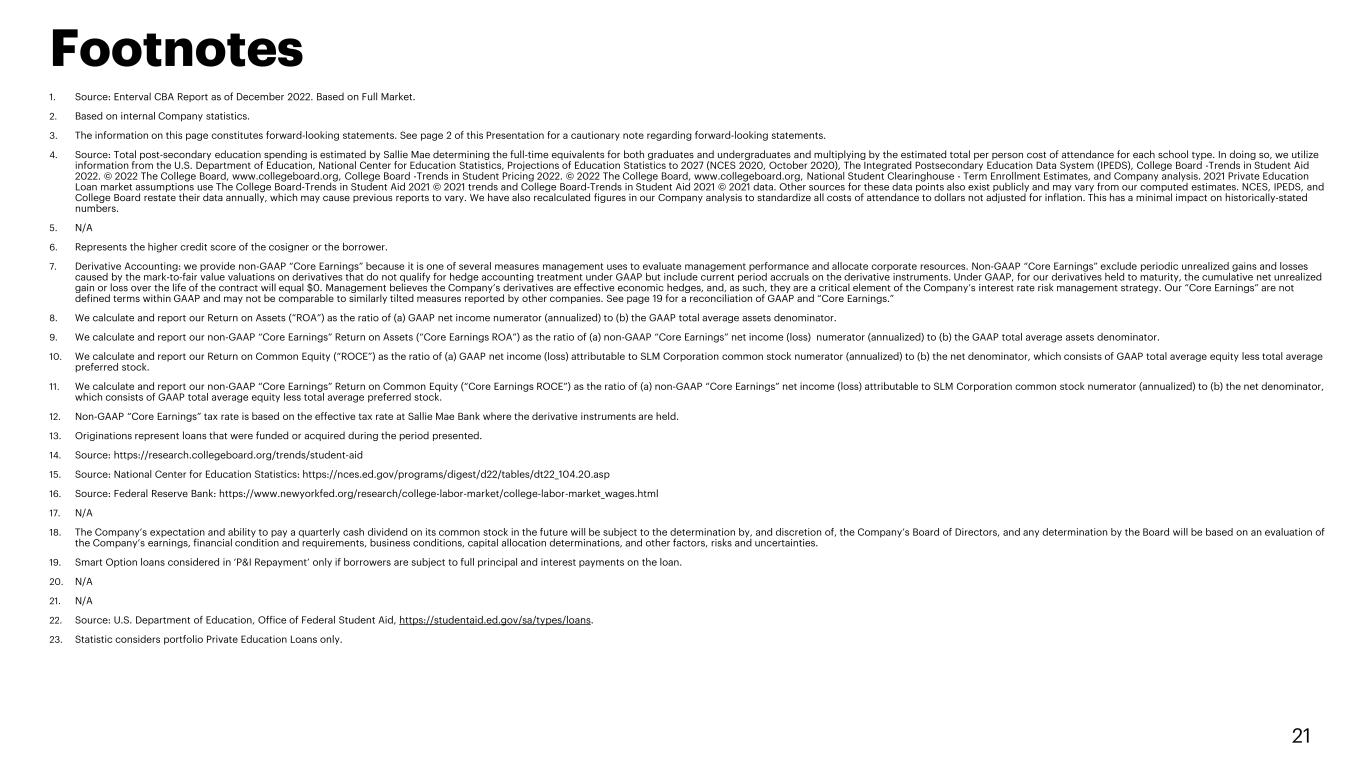 21 Footnotes 1. Source: Enterval CBA Report as of December 2022. Based on Full Market. 2. Based on internal Company statistics. 3. The information on this page constitutes forward-looking statements. See page 2 of this Presentation for a cautionary note regarding forward-looking statements. 4. Source: Total post-secondary education spending is estimated by Sallie Mae determining the full-time equivalents for both graduates and undergraduates and multiplying by the estimated total per person cost of attendance for each school type. In doing so, we utilize information from the U.S. Department of Education, National Center for Education Statistics, Projections of Education Statistics to 2027 (NCES 2020, October 2020), The Integrated Postsecondary Education Data System (IPEDS), College Board -Trends in Student Aid 2022. © 2022 The College Board, www.collegeboard.org, College Board -Trends in Student Pricing 2022. © 2022 The College Board, www.collegeboard.org, National Student Clearinghouse - Term Enrollment Estimates, and Company analysis. 2021 Private Education Loan market assumptions use The College Board-Trends in Student Aid 2021 © 2021 trends and College Board-Trends in Student Aid 2021 © 2021 data. Other sources for these data points also exist publicly and may vary from our computed estimates. NCES, IPEDS, and College Board restate their data annually, which may cause previous reports to vary. We have also recalculated figures in our Company analysis to standardize all costs of attendance to dollars not adjusted for inflation. This has a minimal impact on historically-stated numbers. 5. N/A 6. Represents the higher credit score of the cosigner or the borrower. 7. Derivative Accounting: we provide non-GAAP “Core Earnings” because it is one of several measures management uses to evaluate management performance and allocate corporate resources. Non-GAAP “Core Earnings” exclude periodic unrealized gains and losses caused by the mark-to-fair value valuations on derivatives that do not qualify for hedge accounting treatment under GAAP but include current period accruals on the derivative instruments. Under GAAP, for our derivatives held to maturity, the cumulative net unrealized gain or loss over the life of the contract will equal $0. Management believes the Company’s derivatives are effective economic hedges, and, as such, they are a critical element of the Company’s interest rate risk management strategy. Our “Core Earnings” are not defined terms within GAAP and may not be comparable to similarly tilted measures reported by other companies. See page 19 for a reconciliation of GAAP and “Core Earnings.” 8. We calculate and report our Return on Assets (“ROA”) as the ratio of (a) GAAP net income numerator (annualized) to (b) the GAAP total average assets denominator. 9. We calculate and report our non-GAAP “Core Earnings” Return on Assets (“Core Earnings ROA”) as the ratio of (a) non-GAAP “Core Earnings” net income (loss) numerator (annualized) to (b) the GAAP total average assets denominator. 10. We calculate and report our Return on Common Equity (“ROCE”) as the ratio of (a) GAAP net income (loss) attributable to SLM Corporation common stock numerator (annualized) to (b) the net denominator, which consists of GAAP total average equity less total average preferred stock. 11. We calculate and report our non-GAAP “Core Earnings” Return on Common Equity (“Core Earnings ROCE”) as the ratio of (a) non-GAAP “Core Earnings” net income (loss) attributable to SLM Corporation common stock numerator (annualized) to (b) the net denominator, which consists of GAAP total average equity less total average preferred stock. 12. Non-GAAP “Core Earnings” tax rate is based on the effective tax rate at Sallie Mae Bank where the derivative instruments are held. 13. Originations represent loans that were funded or acquired during the period presented. 14. Source: https://research.collegeboard.org/trends/student-aid 15. Source: National Center for Education Statistics: https://nces.ed.gov/programs/digest/d22/tables/dt22_104.20.asp 16. Source: Federal Reserve Bank: https://www.newyorkfed.org/research/college-labor-market/college-labor-market_wages.html 17. N/A 18. The Company’s expectation and ability to pay a quarterly cash dividend on its common stock in the future will be subject to the determination by, and discretion of, the Company’s Board of Directors, and any determination by the Board will be based on an evaluation of the Company’s earnings, financial condition and requirements, business conditions, capital allocation determinations, and other factors, risks and uncertainties. 19. Smart Option loans considered in ‘P&I Repayment’ only if borrowers are subject to full principal and interest payments on the loan. 20. N/A 21. N/A 22. Source: U.S. Department of Education, Office of Federal Student Aid, https://studentaid.ed.gov/sa/types/loans. 23. Statistic considers portfolio Private Education Loans only.