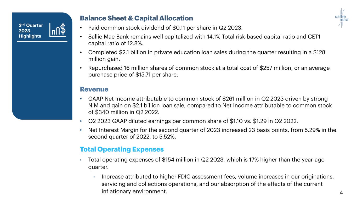 2 Forward-Looking Statements and Disclaimer Cautionary Note Regarding Forward-Looking Statements The following information is current as of July 26, 2023 (unless otherwise noted) and should be read in connection with the press release of SLM Corporation (the “Company”) announcing its financial results for the quarter ended June 30, 2023, the Form 10-Q for the quarter ended June 30, 2023, filed with the Securities and Exchange Commission (“SEC”) on July 26, 2023, and subsequent reports filed with the SEC. This Presentation contains “forward-looking” statements and information based on management’s current expectations as of the date of this Presentation. Statements that are not historical facts, including statements about the Company’s beliefs, opinions, or expectations and statements that assume or are dependent upon future events, are forward-looking statements. This includes, but is not limited to: statements regarding future developments surrounding COVID-19 or any other pandemic, including, without limitation, statements regarding the potential impact of COVID-19 or any other pandemic on the Company’s business, results of operations, financial condition, and/or cash flows; the Company’s expectation and ability to pay a quarterly cash dividend on its common stock in the future, subject to the determination by the Company’s Board of Directors, and based on an evaluation of the Company’s earnings, financial condition and requirements, business conditions, capital allocation determinations, and other factors, risks, and uncertainties; the Company’s 2023 guidance; the Company’s three-year horizon outlook; the Company’s expectation and ability to execute loan sales and share repurchases; the Company’s projections regarding originations, net charge-offs, non-interest expenses, earnings, balance sheet position, and other metrics; any estimates related to accounting standard changes; and any estimates related to the impact of credit administration practices changes, including the results of simulations or other behavioral observations. Forward-looking statements are subject to risks, uncertainties, assumptions, and other factors that may cause actual results to be materially different from those reflected in such forward-looking statements. These factors include, among others, the risks and uncertainties set forth in Item 1A. “Risk Factors” and elsewhere in the Company’s Annual Report on Form 10-K for the year ended Dec. 31, 2022 (filed with the SEC on Feb. 23, 2023) and subsequent filings with the SEC; the societal, business, and legislative/regulatory impact of pandemics and other public heath crises; increases in financing costs; limits on liquidity; increases in costs associated with compliance with laws and regulations; failure to comply with consumer protection, banking, and other laws; changes in accounting standards and the impact of related changes in significant accounting estimates, including any regarding the measurement of the Company’s allowance for credit losses and the related provision expense; any adverse outcomes in any significant litigation to which the Company or any subsidiary is a party; credit risk associated with the Company’s (or any subsidiary's) exposure to third parties, including counterparties to the Company’s (or any subsidiary's) derivative transactions; and changes in the terms of education loans and the educational credit marketplace (including changes resulting from new laws and the implementation of existing laws). The Company could also be affected by, among other things: changes in its funding costs and availability; reductions to its credit ratings; cybersecurity incidents, cyberattacks, and other failures or breaches of its operating systems or infrastructure, including those of third-party vendors; damage to its reputation; risks associated with restructuring initiatives, including failures to successfully implement cost-cutting programs and the adverse effects of such initiatives on the Company’s business; changes in the demand for educational financing or in financing preferences of lenders, educational institutions, students, and their families; changes in law and regulations with respect to the student lending business and financial institutions generally; changes in banking rules and regulations, including increased capital requirements; increased competition from banks and other consumer lenders; the creditworthiness of customers; changes in the general interest rate environment, including the rate relationships among relevant money-market instruments and those of earning assets versus funding arrangements; rates of prepayments on the loans owned by the Company and its subsidiaries; changes in general economic conditions and the Company’s ability to successfully effectuate any acquisitions; and other strategic initiatives. The preparation of the Company’s consolidated financial statements also requires management to make certain estimates and assumptions, including estimates and assumptions about future events. These estimates or assumptions may prove to be incorrect. All forward-looking statements contained in this Presentation are qualified by these cautionary statements and are made only as of the date of this Presentation. The Company does not undertake any obligation to update or revise these forward-looking statements to conform such statements to actual results or changes in its expectations. The Company reports financial results on a GAAP basis and also provides certain non-GAAP “Core Earnings” performance measures. The difference between the Company’s non-GAAP “Core Earnings” and GAAP results for the periods presented were the unrealized, mark-to-fair value gains/losses on derivative contracts (excluding current period accruals on the derivative instruments), net of tax. These are recognized in GAAP, but not in non-GAAP “Core Earnings” results. The Company provides non-GAA
