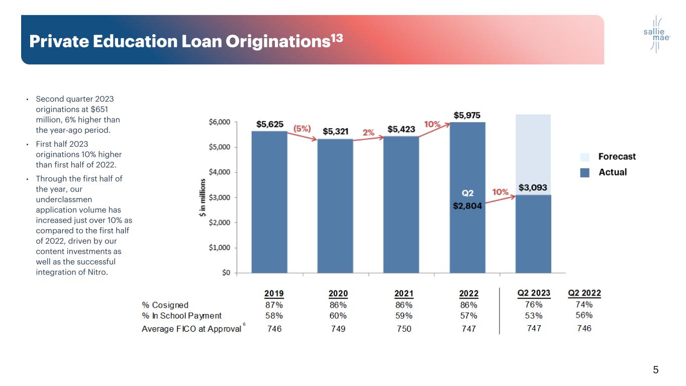 4 Balance Sheet & Capital Allocation • Paid common stock dividend of $0.11 per share in Q2 2023. • Sallie Mae Bank remains well capitalized with 14.1% Total risk-based capital ratio and CET1 capital ratio of 12.8%. • Completed $2.1 billion in private education loan sales during the quarter resulting in a $128 million gain. • Repurchased 16 million shares of common stock at a total cost of $257 million, or an average purchase price of $15.71 per share. Revenue • GAAP Net Income attributable to common stock of $261 million in Q2 2023 driven by strong NIM and gain on $2.1 billion loan sale, compared to Net Income attributable to common stock of $340 million in Q2 2022. • Q2 2023 GAAP diluted earnings per common share of $1.10 vs. $1.29 in Q2 2022. • Net Interest Margin for the second quarter of 2023 increased 23 basis points, from 5.29% in the second quarter of 2022, to 5.52%. Total Operating Expenses • Total operating expenses of $154 million in Q2 2023, which is 17% higher than the year-ago quarter. • Increase attributed to higher FDIC assessment fees, volume increases in our originations, servicing and collections operations, and our absorption of the effects of the current inflationary environment. 2nd Quarter 2023 Highlights