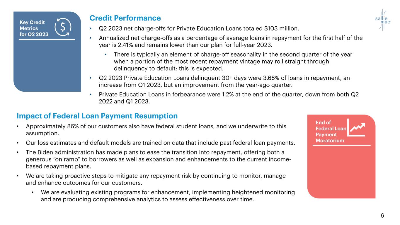 5 Private Education Loan Originations13 • Second quarter 2023 originations at $651 million, 6% higher than the year-ago period. • First half 2023 originations 10% higher than first half of 2022. • Through the first half of the year, our underclassmen application volume has increased just over 10% as compared to the first half of 2022, driven by our content investments as well as the successful integration of Nitro. 6