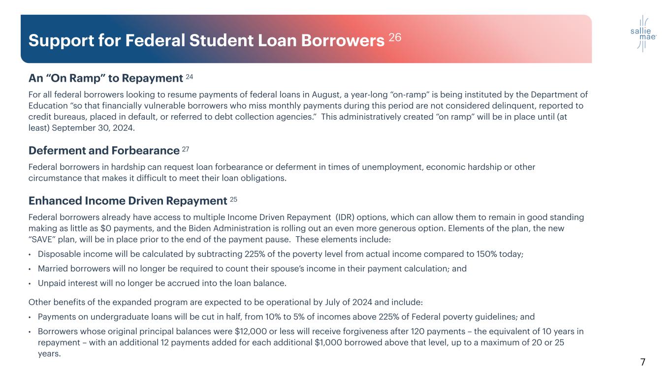 6 Key Credit Metrics for Q2 2023 End of Federal Loan Payment Moratorium Credit Performance • Q2 2023 net charge-offs for Private Education Loans totaled $103 million. • Annualized net charge-offs as a percentage of average loans in repayment for the first half of the year is 2.41% and remains lower than our plan for full-year 2023. • There is typically an element of charge-off seasonality in the second quarter of the year when a portion of the most recent repayment vintage may roll straight through delinquency to default; this is expected. • Q2 2023 Private Education Loans delinquent 30+ days were 3.68% of loans in repayment, an increase from Q1 2023, but an improvement from the year-ago quarter. • Private Education Loans in forbearance were 1.2% at the end of the quarter, down from both Q2 2022 and Q1 2023. Impact of Federal Loan Payment Resumption • Approximately 86% of our customers also have federal student loans, and we underwrite to this assumption. • Our loss estimates and default models are trained on data that include past federal loan payments. • The Biden administration has made plans to ease the transition into repayment, offering both a generous “on ramp” to borrowers as well as expansion and enhancements to the current income- based repayment plans. • We are taking proactive steps to mitigate any repayment risk by continuing to monitor, manage and enhance outcomes for our customers. • We are evaluating existing programs for enhancement, implementing heightened monitoring and are producing comprehensive analytics to assess effectiveness over time.