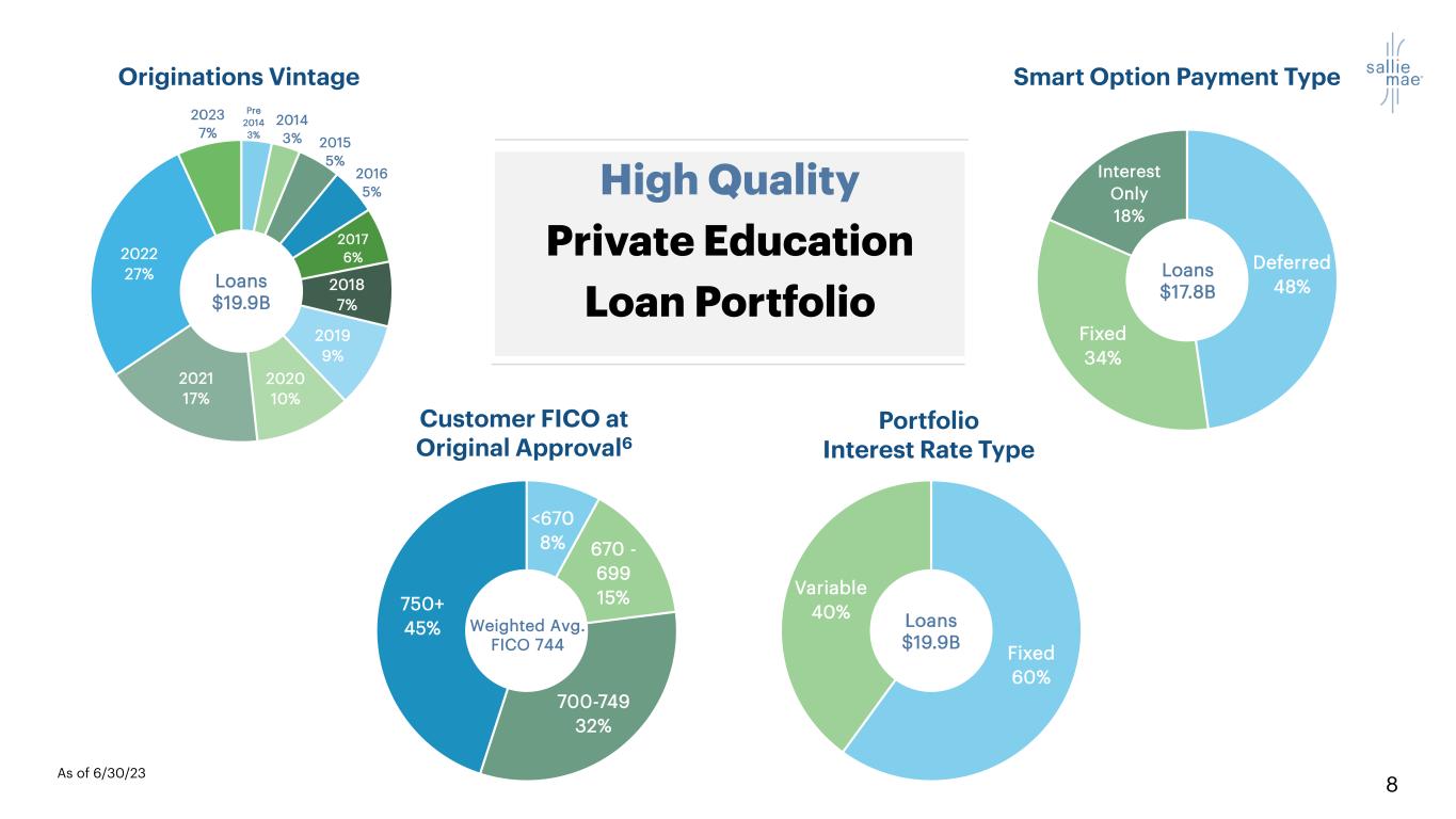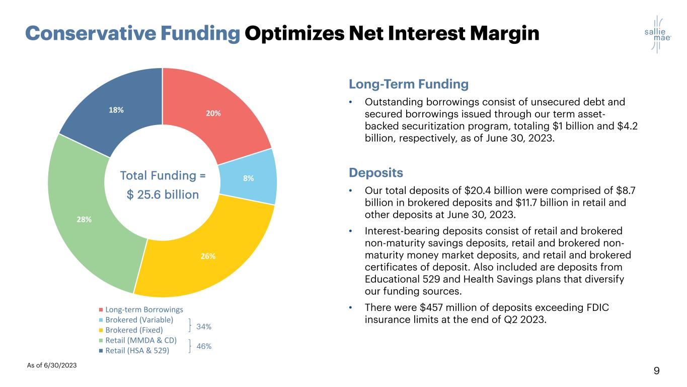 8As of 6/30/23 Customer FICO at Original Approval6 High Quality Private Education Loan Portfolio Smart Option Payment TypeOriginations Vintage Portfolio Interest Rate Type Fixed 60% Variable 40% <670 8% 670 - 699 15% 700-749 32% 750+ 45% Pre 2014 3% 2014 3% 2015 5% 2016 5% 2017 6% 2018 7% 2019 9% 2020 10% 2021 17% 2022 27% 2023 7% Deferred 48% Fixed 34% Interest Only 18% Loans $19.9B Weighted Avg. FICO 744 Loans $17.8BLoans $19.9B