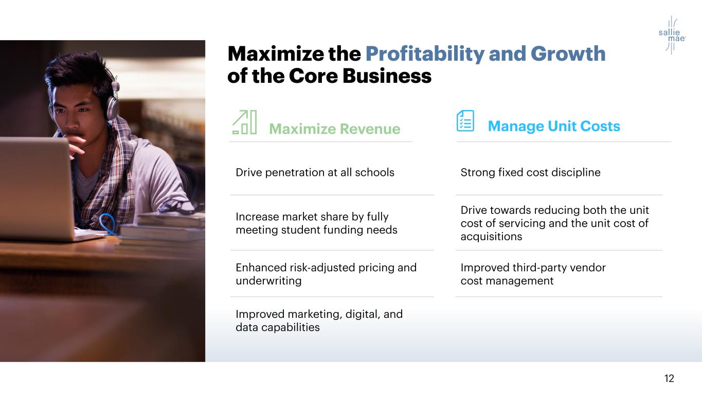 11 Clear Strategy to Prove this Investment Thesis Maximize the profitability and growth of our core business Better inform the external narrative about private student lending and Sallie Mae Maximize the value of our brand and attractive customer base Maintain a rigorous and predictable capital allocation and return program to create shareholder value 1. 2. 3. 4. Strategic Imperatives: