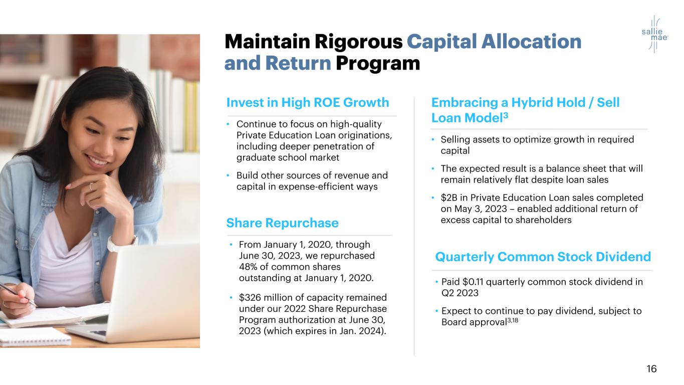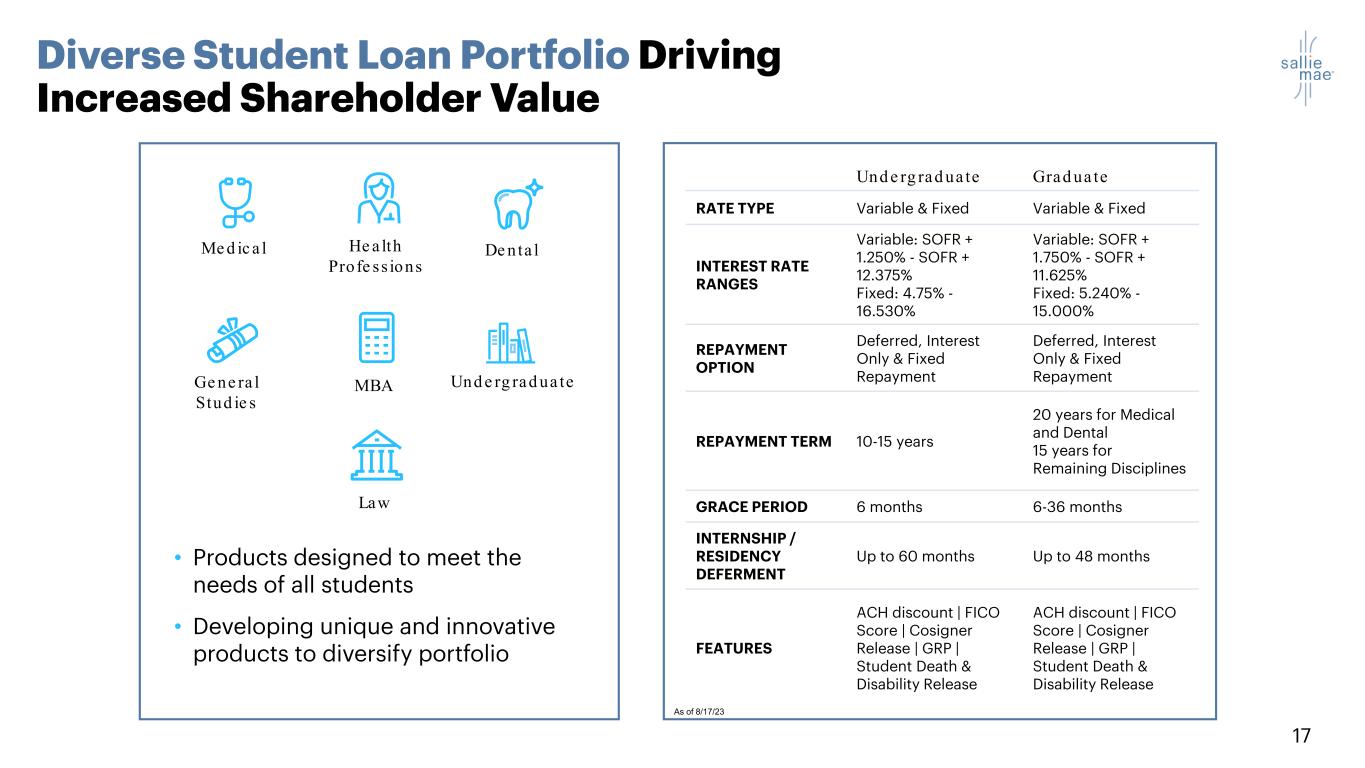 16 Maintain Rigorous Capital Allocation and Return Program Invest in High ROE Growth • Continue to focus on high-quality Private Education Loan originations, including deeper penetration of graduate school market • Build other sources of revenue and capital in expense-efficient ways Quarterly Common Stock Dividend • Paid $0.11 quarterly common stock dividend in Q2 2023 • Expect to continue to pay dividend, subject to Board approval3,18 Share Repurchase • From January 1, 2020, through June 30, 2023, we repurchased 48% of common shares outstanding at January 1, 2020. • $326 million of capacity remained under our 2022 Share Repurchase Program authorization at June 30, 2023 (which expires in Jan. 2024). We allocate capital with discipline Embracing a Hybrid Hold / Sell Loan Model3 • Selling assets to optimize growth in required capital • The expected result is a balance sheet that will remain relatively flat despite loan sales • $2B in Private Education Loan sales completed on May 3, 2023 – enabled additional return of excess capital to shareholders