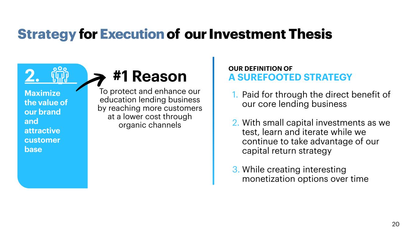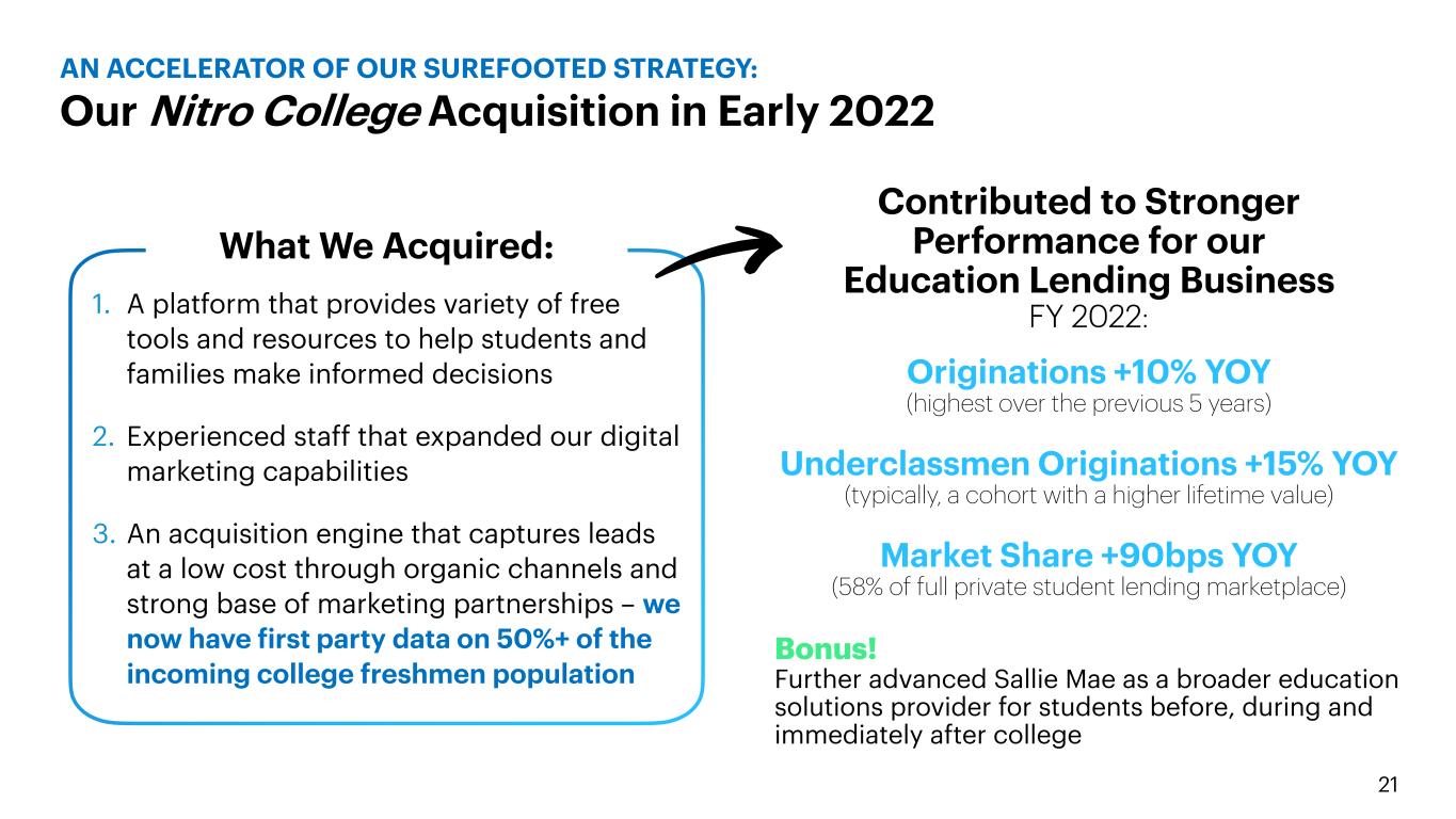 20 2. Maximize the value of our brand and attractive customer base #1 Reason To protect and enhance our education lending business by reaching more customers at a lower cost through organic channels OUR DEFINITION OF A SUREFOOTED STRATEGY 1. Paid for through the direct benefit of our core lending business 2. With small capital investments as we test, learn and iterate while we continue to take advantage of our capital return strategy 3. While creating interesting monetization options over time Strategy for Execution of our Investment Thesis