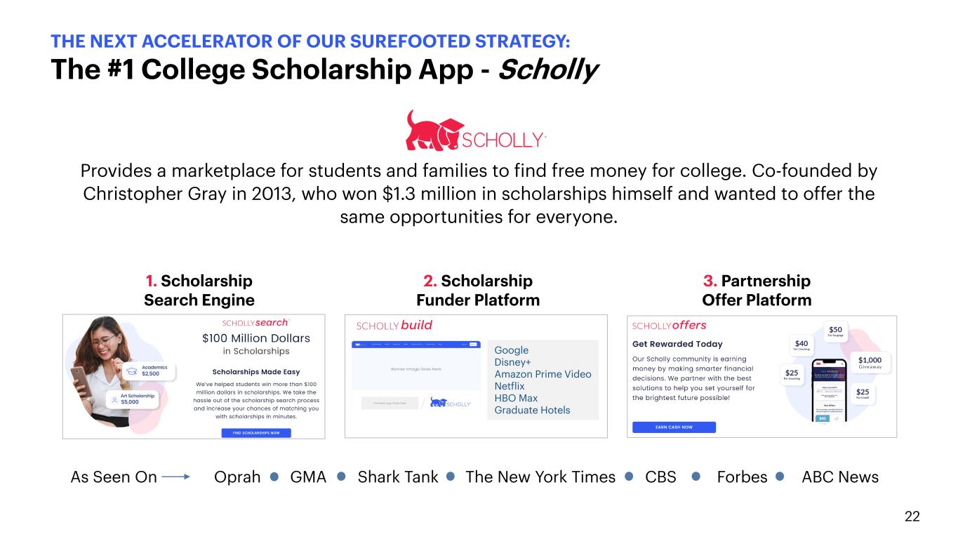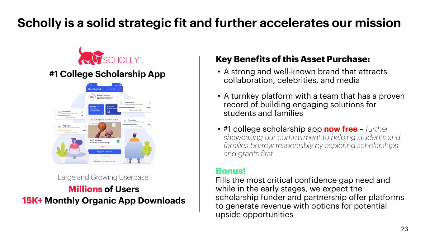 22 THE NEXT ACCELERATOR OF OUR SUREFOOTED STRATEGY: The #1 College Scholarship App - Scholly Provides a marketplace for students and families to find free money for college. Co-founded by Christopher Gray in 2013, who won $1.3 million in scholarships himself and wanted to offer the same opportunities for everyone. 1. Scholarship Search Engine 2. Scholarship Funder Platform 3. Partnership Offer Platform Google Disney+ Amazon Prime Video Netflix HBO Max Graduate Hotels As Seen On Oprah GMA Shark Tank The New York Times CBS Forbes ABC News