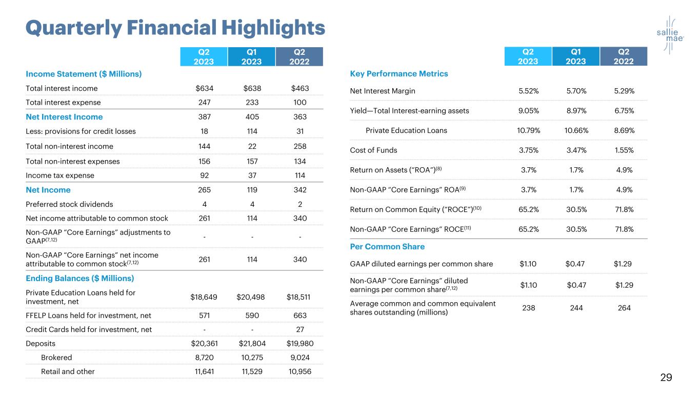29 Quarterly Financial Highlights Q2 2023 Q1 2023 Q2 2022 Income Statement ($ Millions) Total interest income $634 $638 $463 Total interest expense 247 233 100 Net Interest Income 387 405 363 Less: provisions for credit losses 18 114 31 Total non-interest income 144 22 258 Total non-interest expenses 156 157 134 Income tax expense 92 37 114 Net Income 265 119 342 Preferred stock dividends 4 4 2 Net income attributable to common stock 261 114 340 Non-GAAP “Core Earnings” adjustments to GAAP(7,12) - - - Non-GAAP “Core Earnings” net income attributable to common stock(7,12) 261 114 340 Ending Balances ($ Millions) Private Education Loans held for investment, net $18,649 $20,498 $18,511 FFELP Loans held for investment, net 571 590 663 Credit Cards held for investment, net - - 27 Deposits $20,361 $21,804 $19,980 Brokered 8,720 10,275 9,024 Retail and other 11,641 11,529 10,956 Q2 2023 Q1 2023 Q2 2022 Key Performance Metrics Net Interest Margin 5.52% 5.70% 5.29% Yield—Total Interest-earning assets 9.05% 8.97% 6.75% Private Education Loans 10.79% 10.66% 8.69% Cost of Funds 3.75% 3.47% 1.55% Return on Assets (“ROA”)(8) 3.7% 1.7% 4.9% Non-GAAP “Core Earnings” ROA(9) 3.7% 1.7% 4.9% Return on Common Equity (“ROCE”)(10) 65.2% 30.5% 71.8% Non-GAAP “Core Earnings” ROCE(11) 65.2% 30.5% 71.8% Per Common Share GAAP diluted earnings per common share $1.10 $0.47 $1.29 Non-GAAP “Core Earnings” diluted earnings per common share(7,12) $1.10 $0.47 $1.29 Average common and common equivalent shares outstanding (millions) 238 244 264