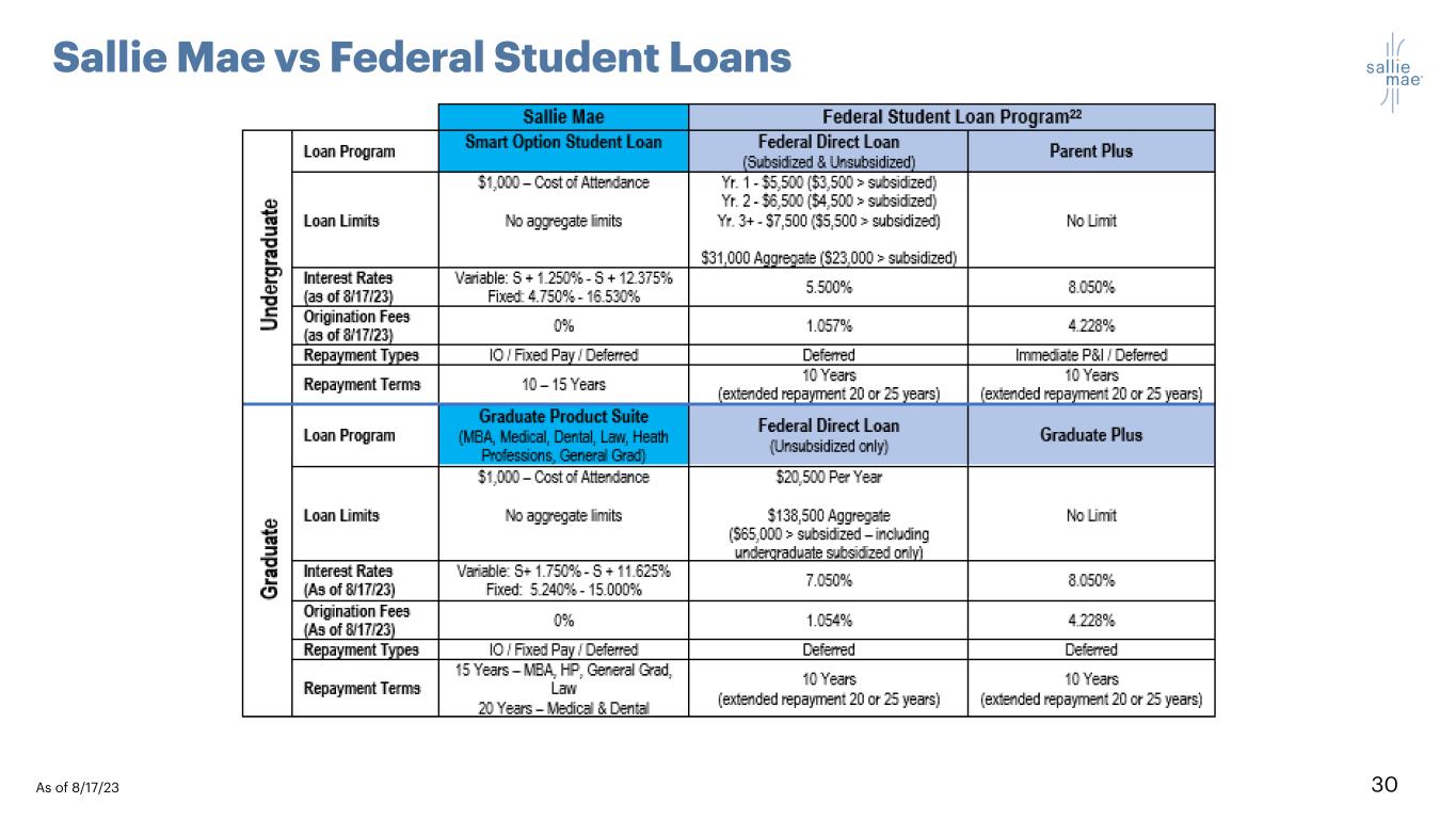 30 Sallie Mae vs Federal Student Loans As of 8/17/23