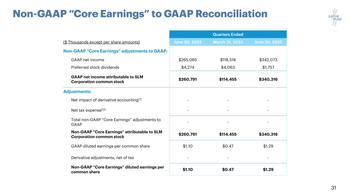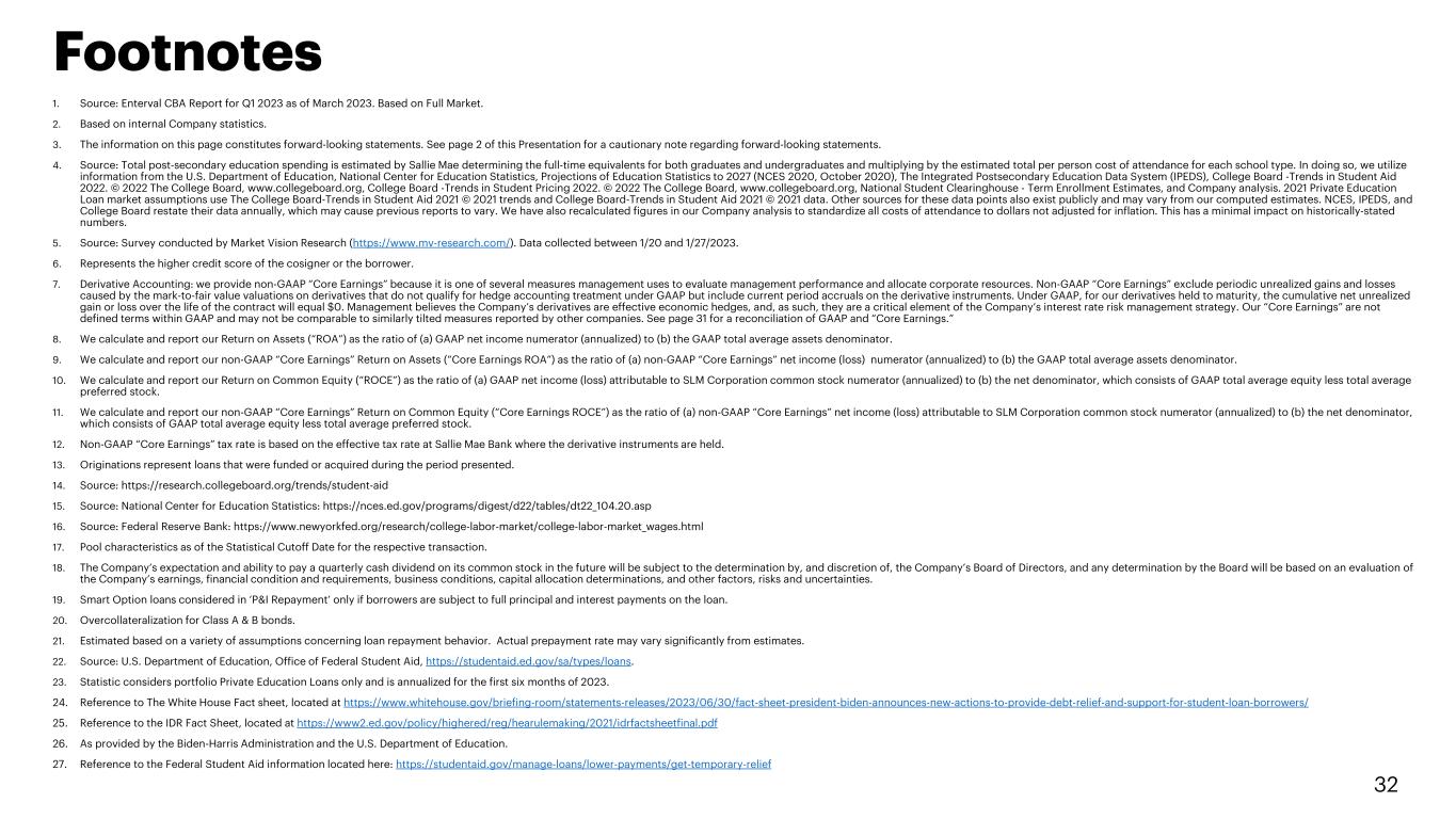 31 Non-GAAP “Core Earnings” to GAAP Reconciliation Quarters Ended ($ Thousands except per share amounts) June 30, 2023 March 31, 2023 June 30, 2022 Non-GAAP “Core Earnings” adjustments to GAAP: GAAP net income $265,065 $118,518 $342,073 Preferred stock dividends $4,274 $4,063 $1,757 GAAP net income attributable to SLM Corporation common stock $260,791 $114,455 $340,316 Adjustments: Net impact of derivative accounting(7) - - - Net tax expense(12) - - - Total non-GAAP “Core Earnings” adjustments to GAAP - - - Non-GAAP “Core Earnings” attributable to SLM Corporation common stock $260,791 $114,455 $340,316 GAAP diluted earnings per common share $1.10 $0.47 $1.29 Derivative adjustments, net of tax - - - Non-GAAP “Core Earnings” diluted earnings per common share $1.10 $0.47 $1.29