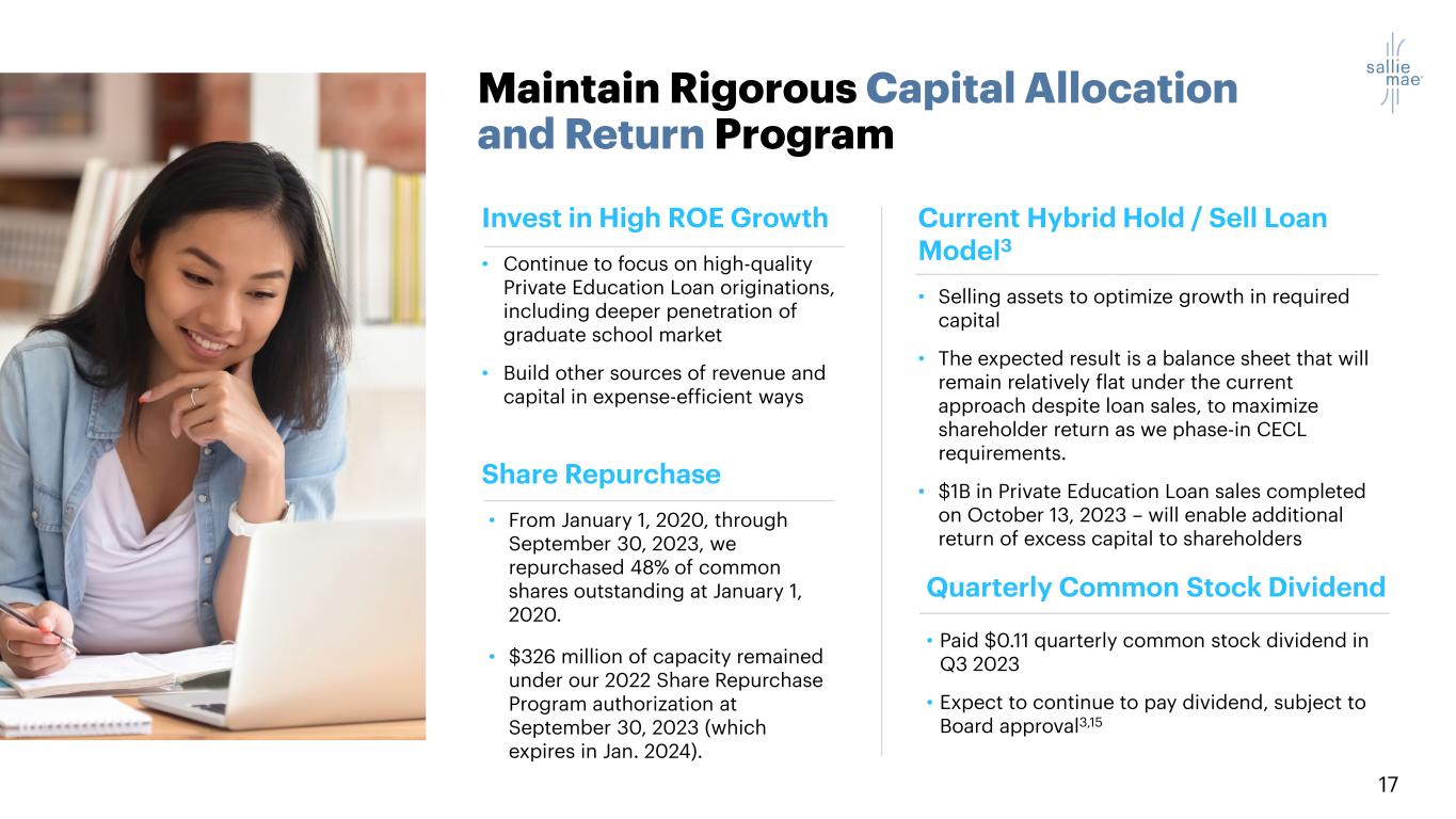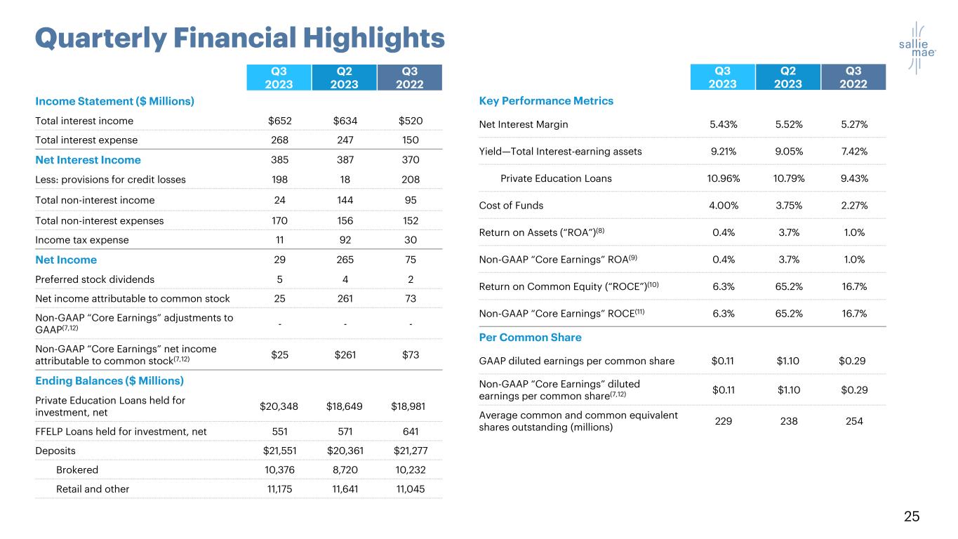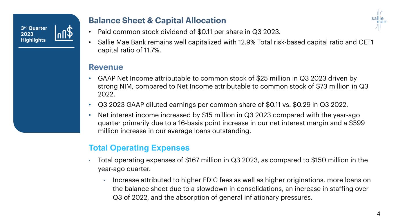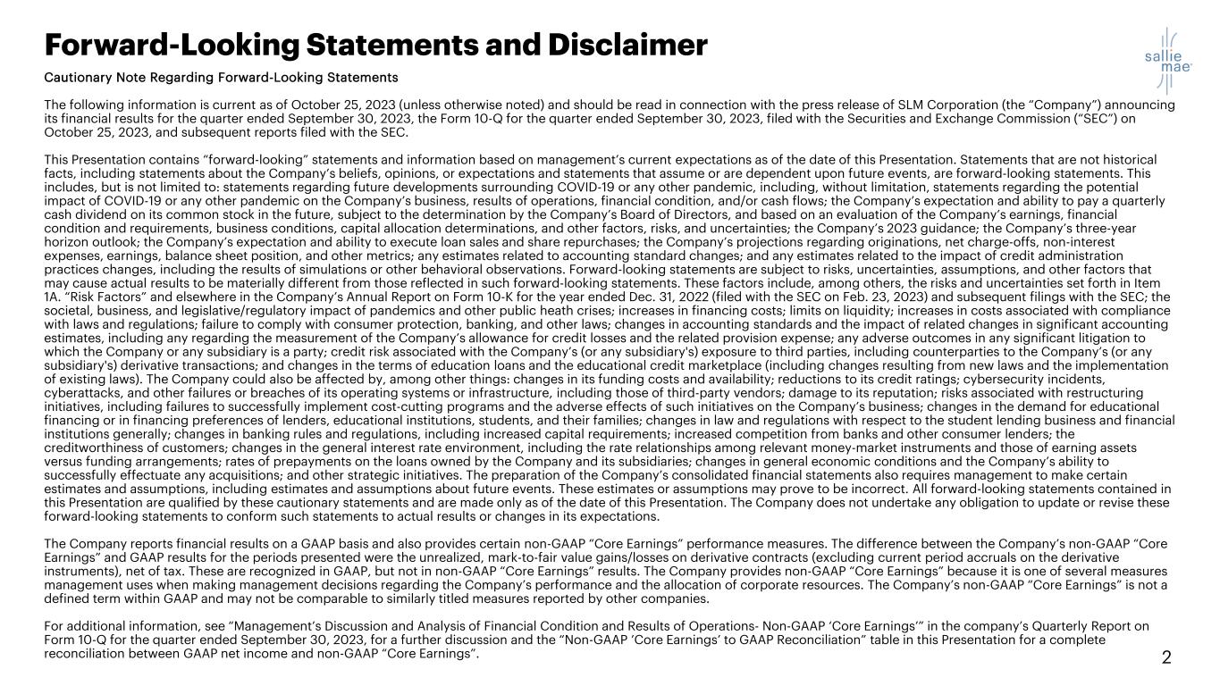 2 Forward-Looking Statements and Disclaimer Cautionary Note Regarding Forward-Looking Statements The following information is current as of October 25, 2023 (unless otherwise noted) and should be read in connection with the press release of SLM Corporation (the “Company”) announcing its financial results for the quarter ended September 30, 2023, the Form 10-Q for the quarter ended September 30, 2023, filed with the Securities and Exchange Commission (“SEC”) on October 25, 2023, and subsequent reports filed with the SEC. This Presentation contains “forward-looking” statements and information based on management’s current expectations as of the date of this Presentation. Statements that are not historical facts, including statements about the Company’s beliefs, opinions, or expectations and statements that assume or are dependent upon future events, are forward-looking statements. This includes, but is not limited to: statements regarding future developments surrounding COVID-19 or any other pandemic, including, without limitation, statements regarding the potential impact of COVID-19 or any other pandemic on the Company’s business, results of operations, financial condition, and/or cash flows; the Company’s expectation and ability to pay a quarterly cash dividend on its common stock in the future, subject to the determination by the Company’s Board of Directors, and based on an evaluation of the Company’s earnings, financial condition and requirements, business conditions, capital allocation determinations, and other factors, risks, and uncertainties; the Company’s 2023 guidance; the Company’s three-year horizon outlook; the Company’s expectation and ability to execute loan sales and share repurchases; the Company’s projections regarding originations, net charge-offs, non-interest expenses, earnings, balance sheet position, and other metrics; any estimates related to accounting standard changes; and any estimates related to the impact of credit administration practices changes, including the results of simulations or other behavioral observations. Forward-looking statements are subject to risks, uncertainties, assumptions, and other factors that may cause actual results to be materially different from those reflected in such forward-looking statements. These factors include, among others, the risks and uncertainties set forth in Item 1A. “Risk Factors” and elsewhere in the Company’s Annual Report on Form 10-K for the year ended Dec. 31, 2022 (filed with the SEC on Feb. 23, 2023) and subsequent filings with the SEC; the societal, business, and legislative/regulatory impact of pandemics and other public heath crises; increases in financing costs; limits on liquidity; increases in costs associated with compliance with laws and regulations; failure to comply with consumer protection, banking, and other laws; changes in accounting standards and the impact of related changes in significant accounting estimates, including any regarding the measurement of the Company’s allowance for credit losses and the related provision expense; any adverse outcomes in any significant litigation to which the Company or any subsidiary is a party; credit risk associated with the Company’s (or any subsidiary's) exposure to third parties, including counterparties to the Company’s (or any subsidiary's) derivative transactions; and changes in the terms of education loans and the educational credit marketplace (including changes resulting from new laws and the implementation of existing laws). The Company could also be affected by, among other things: changes in its funding costs and availability; reductions to its credit ratings; cybersecurity incidents, cyberattacks, and other failures or breaches of its operating systems or infrastructure, including those of third-party vendors; damage to its reputation; risks associated with restructuring initiatives, including failures to successfully implement cost-cutting programs and the adverse effects of such initiatives on the Company’s business; changes in the demand for educational financing or in financing preferences of lenders, educational institutions, students, and their families; changes in law and regulations with respect to the student lending business and financial institutions generally; changes in banking rules and regulations, including increased capital requirements; increased competition from banks and other consumer lenders; the creditworthiness of customers; changes in the general interest rate environment, including the rate relationships among relevant money-market instruments and those of earning assets versus funding arrangements; rates of prepayments on the loans owned by the Company and its subsidiaries; changes in general economic conditions and the Company’s ability to successfully effectuate any acquisitions; and other strategic initiatives. The preparation of the Company’s consolidated financial statements also requires management to make certain estimates and assumptions, including estimates and assumptions about future events. These estimates or assumptions may prove to be incorrect. All forward-looking statements contained in this Presentation are qualified by these cautionary statements and are made only as of the date of this Presentation. The Company does not undertake any obligation to update or revise these forward-looking statements to conform such statements to actual results or changes in its expectations. The Company reports financial results on a GAAP basis and also provides certain non-GAAP “Core Earnings” performance measures. The difference between the Company’s non-GAAP “Core Earnings” and GAAP results for the periods presented were the unrealized, mark-to-fair value gains/losses on derivative contracts (excluding current period accruals on the derivative instruments), net of tax. These are recognized in GAAP, but not in non-GAAP “Core Earnings” results. The Company 