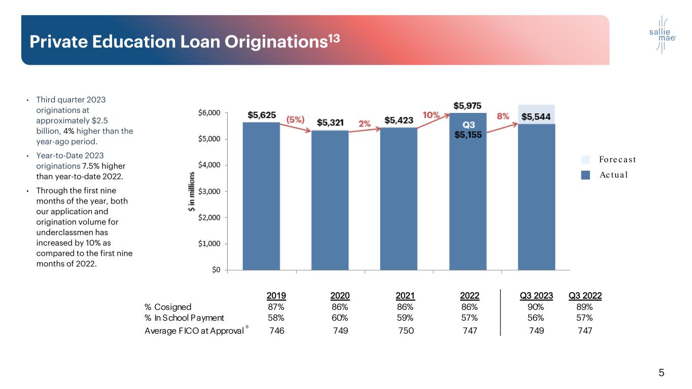 4 Balance Sheet & Capital Allocation • Paid common stock dividend of $0.11 per share in Q3 2023. • Sallie Mae Bank remains well capitalized with 12.9% Total risk-based capital ratio and CET1 capital ratio of 11.7%. Revenue • GAAP Net Income attributable to common stock of $25 million in Q3 2023 driven by strong NIM, compared to Net Income attributable to common stock of $73 million in Q3 2022. • Q3 2023 GAAP diluted earnings per common share of $0.11 vs. $0.29 in Q3 2022. • Net interest income increased by $15 million in Q3 2023 compared with the year-ago quarter primarily due to a 16-basis point increase in our net interest margin and a $599 million increase in our average loans outstanding. Total Operating Expenses • Total operating expenses of $167 million in Q3 2023, as compared to $150 million in the year-ago quarter. • Increase attributed to higher FDIC fees as well as higher originations, more loans on the balance sheet due to a slowdown in consolidations, an increase in staffing over Q3 of 2022, and the absorption of general inflationary pressures. 3rd Quarter 2023 Highlights