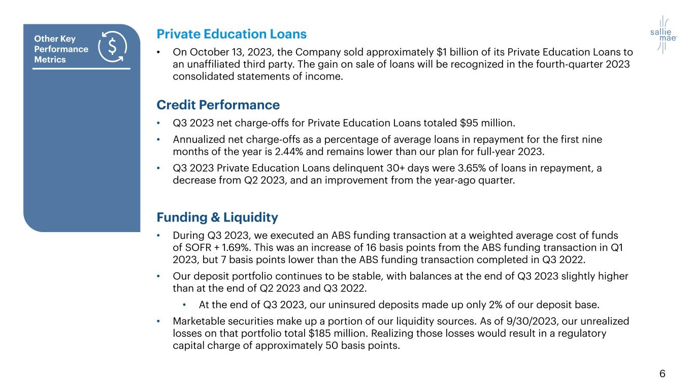 5 Ac tua l 2019 87% 58% 746 2020 86% 60% 749 2021 86% 59% 750 Private Education Loan Originations13 • Third quarter 2023 originations at approximately $2.5 billion, 4% higher than the year-ago period. • Year-to-Date 2023 originations 7.5% higher than year-to-date 2022. • Through the first nine months of the year, both our application and origination volume for underclassmen has increased by 10% as compared to the first nine months of 2022. Fore c as t 2022 86% 57% 747 % Cosigned % In School Payment Average FICO at Approval9 Q3 2023 90% 56% 749 Q3 2022 89% 57% 7476