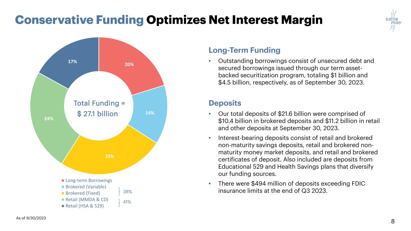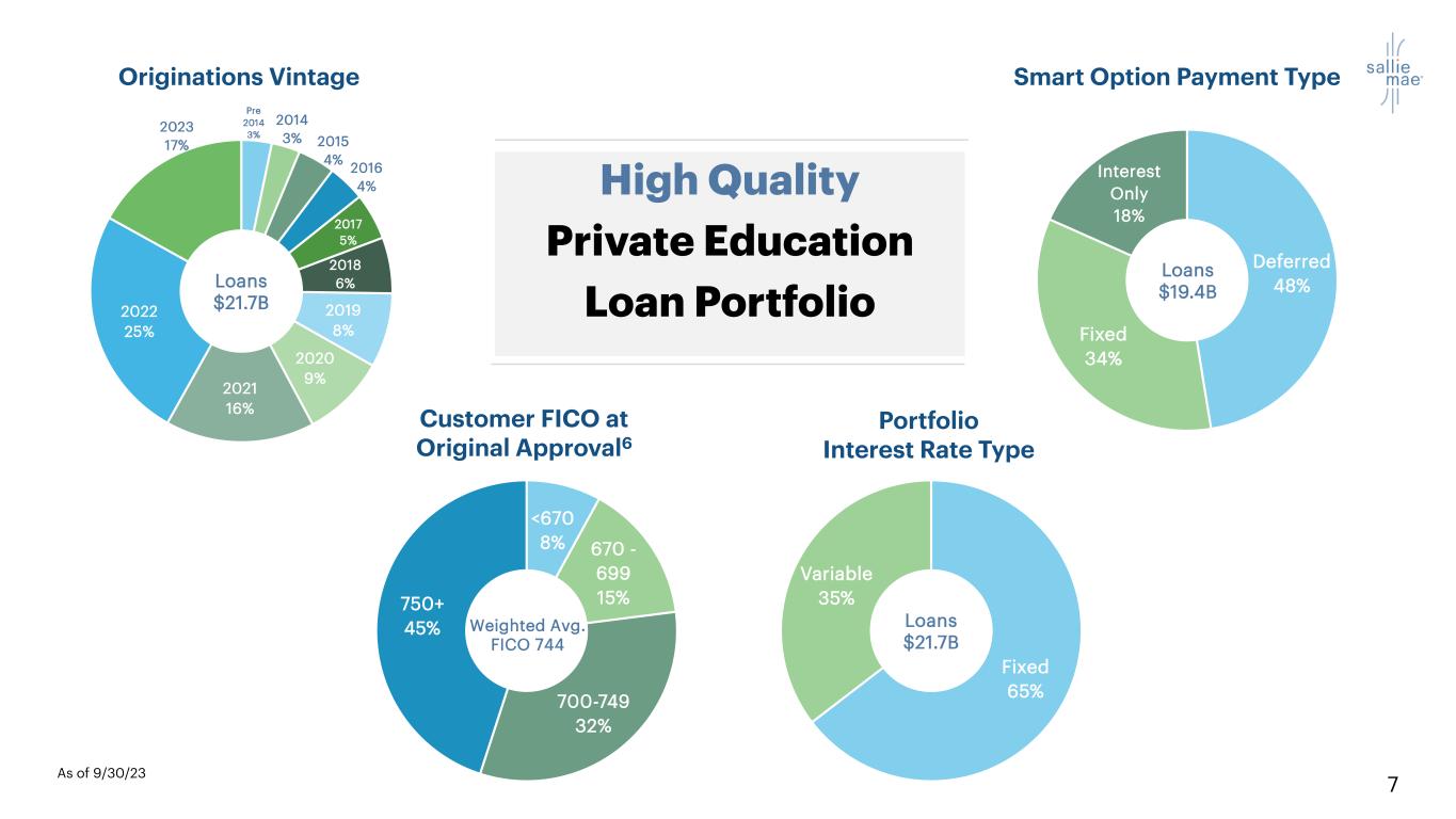 7As of 9/30/23 Customer FICO at Original Approval6 High Quality Private Education Loan Portfolio Smart Option Payment TypeOriginations Vintage Portfolio Interest Rate Type Fixed 65% Variable 35% <670 8% 670 - 699 15% 700-749 32% 750+ 45% Pre 2014 3% 2014 3% 2015 4% 2016 4% 2017 5% 2018 6% 2019 8% 2020 9%2021 16% 2022 25% 2023 17% Deferred 48% Fixed 34% Interest Only 18% Loans $21.7B Weighted Avg. FICO 744 Loans $19.4BLoans $21.7B