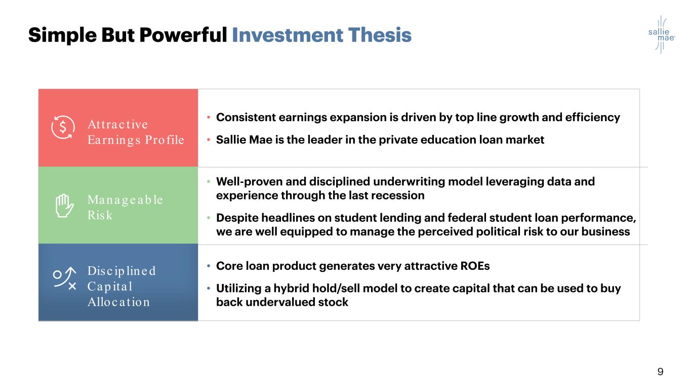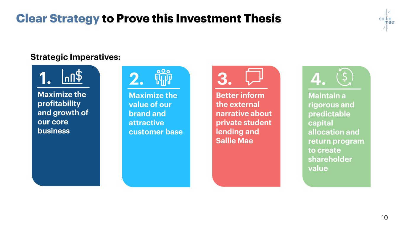 9 Simple But Powerful Investment Thesis • Consistent earnings expansion is driven by top line growth and efficiency • Sallie Mae is the leader in the private education loan market • Well-proven and disciplined underwriting model leveraging data and experience through the last recession • Despite headlines on student lending and federal student loan performance, we are well equipped to manage the perceived political risk to our business • Core loan product generates very attractive ROEs • Utilizing a hybrid hold/sell model to create capital that can be used to buy back undervalued stock Attrac t ive Ea rn ing s Profile Manag e ab le Risk Disc ip line d Cap ita l Alloc a t ion