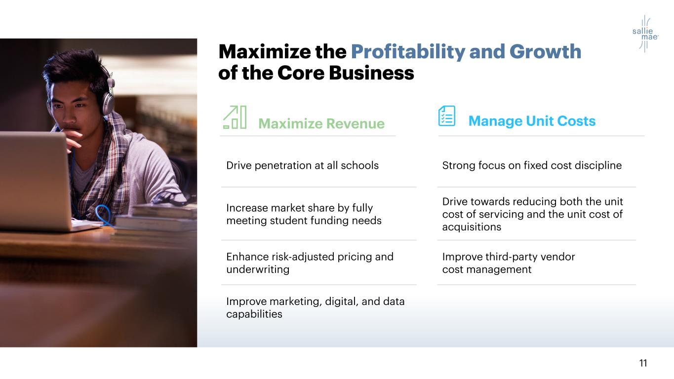 10 Clear Strategy to Prove this Investment Thesis Maximize the profitability and growth of our core business Better inform the external narrative about private student lending and Sallie Mae Maximize the value of our brand and attractive customer base Maintain a rigorous and predictable capital allocation and return program to create shareholder value 1. 2. 3. 4. Strategic Imperatives: