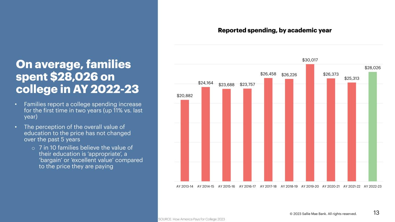 • Families report a college spending increase for the first time in two years (up 11% vs. last year) • The perception of the overall value of education to the price has not changed over the past 5 years o 7 in 10 families believe the value of their education is ‘appropriate’, a ‘bargain’ or ‘excellent value’ compared to the price they are paying On average, families spent $28,026 on college in AY 2022-23 13© 2023 Sallie Mae Bank. All rights reserved. SOURCE: How America Pays for College 2023 $20,882 $24,164 $23,688 $23,757 $26,458 $26,226 $30,017 $26,373 $25,313 $28,026 AY 2013-14 AY 2014-15 AY 2015-16 AY 2016-17 AY 2017-18 AY 2018-19 AY 2019-20 AY 2020-21 AY 2021-22 AY 2022-23 Reported spending, by academic year