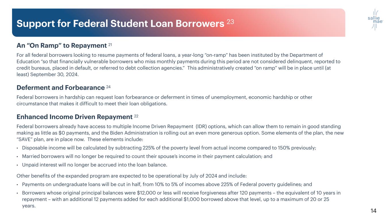 14 Support for Federal Student Loan Borrowers 23 An “On Ramp” to Repayment 21 For all federal borrowers looking to resume payments of federal loans, a year-long “on-ramp” has been instituted by the Department of Education “so that financially vulnerable borrowers who miss monthly payments during this period are not considered delinquent, reported to credit bureaus, placed in default, or referred to debt collection agencies.” This administratively created “on ramp” will be in place until (at least) September 30, 2024. Deferment and Forbearance 24 Federal borrowers in hardship can request loan forbearance or deferment in times of unemployment, economic hardship or other circumstance that makes it difficult to meet their loan obligations. Enhanced Income Driven Repayment 22 Federal borrowers already have access to multiple Income Driven Repayment (IDR) options, which can allow them to remain in good standing making as little as $0 payments, and the Biden Administration is rolling out an even more generous option. Some elements of the plan, the new “SAVE” plan, are in place now. These elements include: • Disposable income will be calculated by subtracting 225% of the poverty level from actual income compared to 150% previously; • Married borrowers will no longer be required to count their spouse’s income in their payment calculation; and • Unpaid interest will no longer be accrued into the loan balance. Other benefits of the expanded program are expected to be operational by July of 2024 and include: • Payments on undergraduate loans will be cut in half, from 10% to 5% of incomes above 225% of Federal poverty guidelines; and • Borrowers whose original principal balances were $12,000 or less will receive forgiveness after 120 payments – the equivalent of 10 years in repayment – with an additional 12 payments added for each additional $1,000 borrowed above that level, up to a maximum of 20 or 25 years.